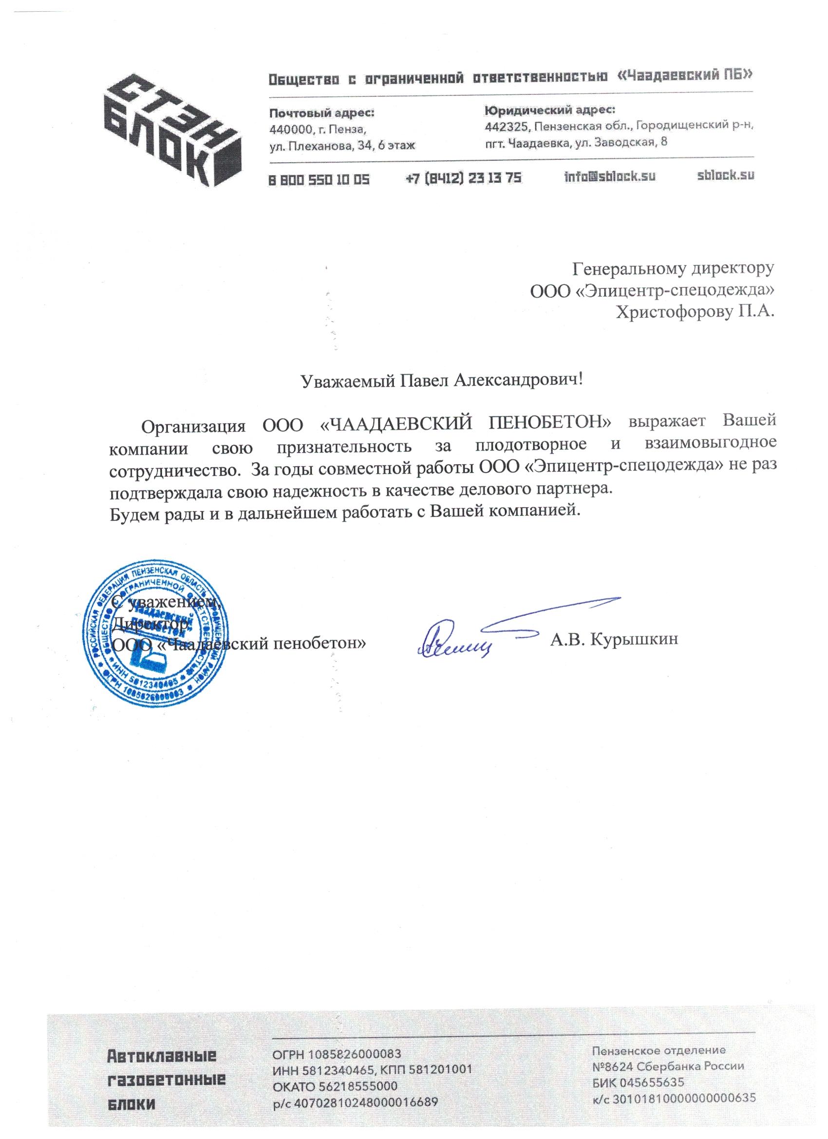 ООО "Чаадаевский пенобетон" выражает свою признательность за плодотворное и взаимовыгодное сотрудничество. За годы совместной работы ООО "Эпицентр-спецодежда" не раз подтверждала свою надежность в качестве делового партнера.