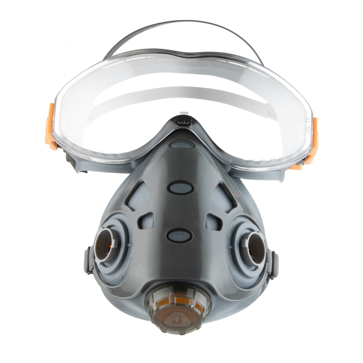Компактная и легкая полумаска с встроенными очками. Идеальное решение для защиты зрения и дыхания в одном продукте. Интегрированная съёмная защитная линза из поликарбоната, выдерживающая удары частиц, летящих со скоростью 45 м/с.