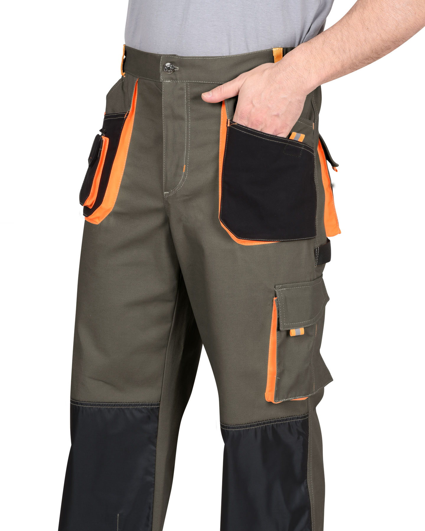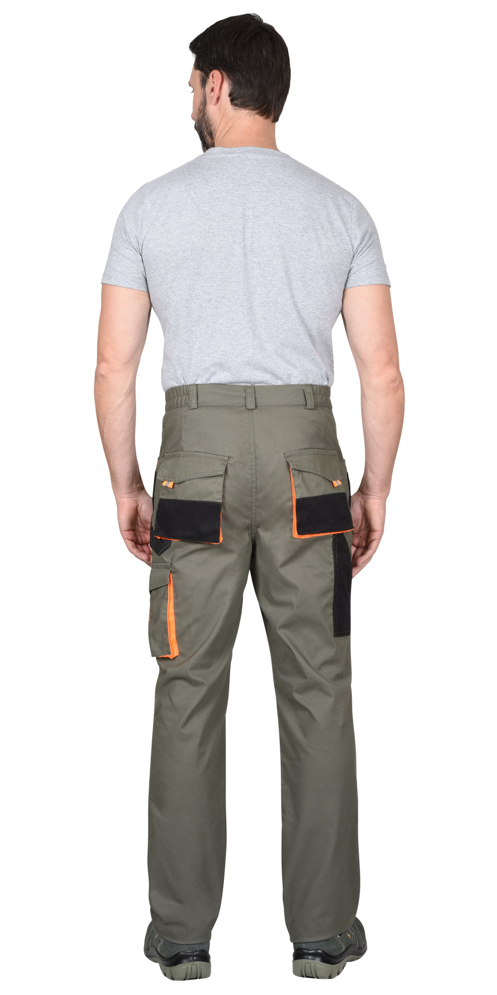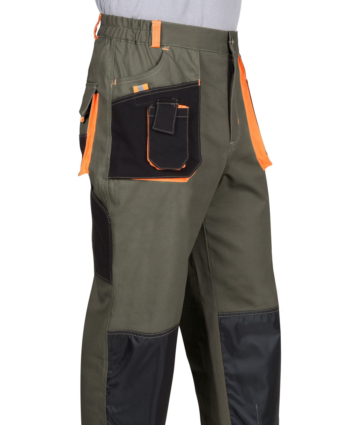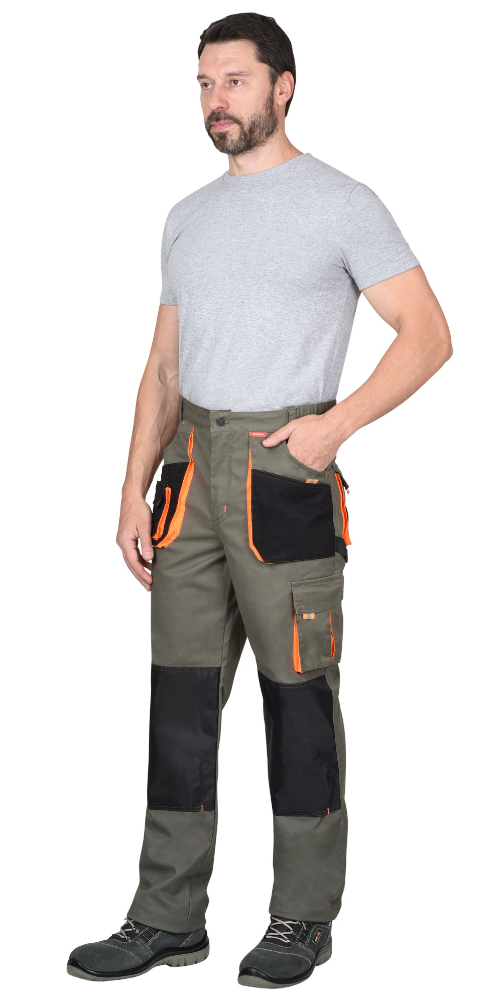 Брюки с застёжкой гульфика на молнию, с поясом на резинке, со шлевками, с накладными боковыми объемными карманами, с объемными наколенниками, с накладным объемным карманом на боковом шве с клапаном на липучке, двумя объемными карманами с клапанами на задних половинках, и карманами для инструментов.
