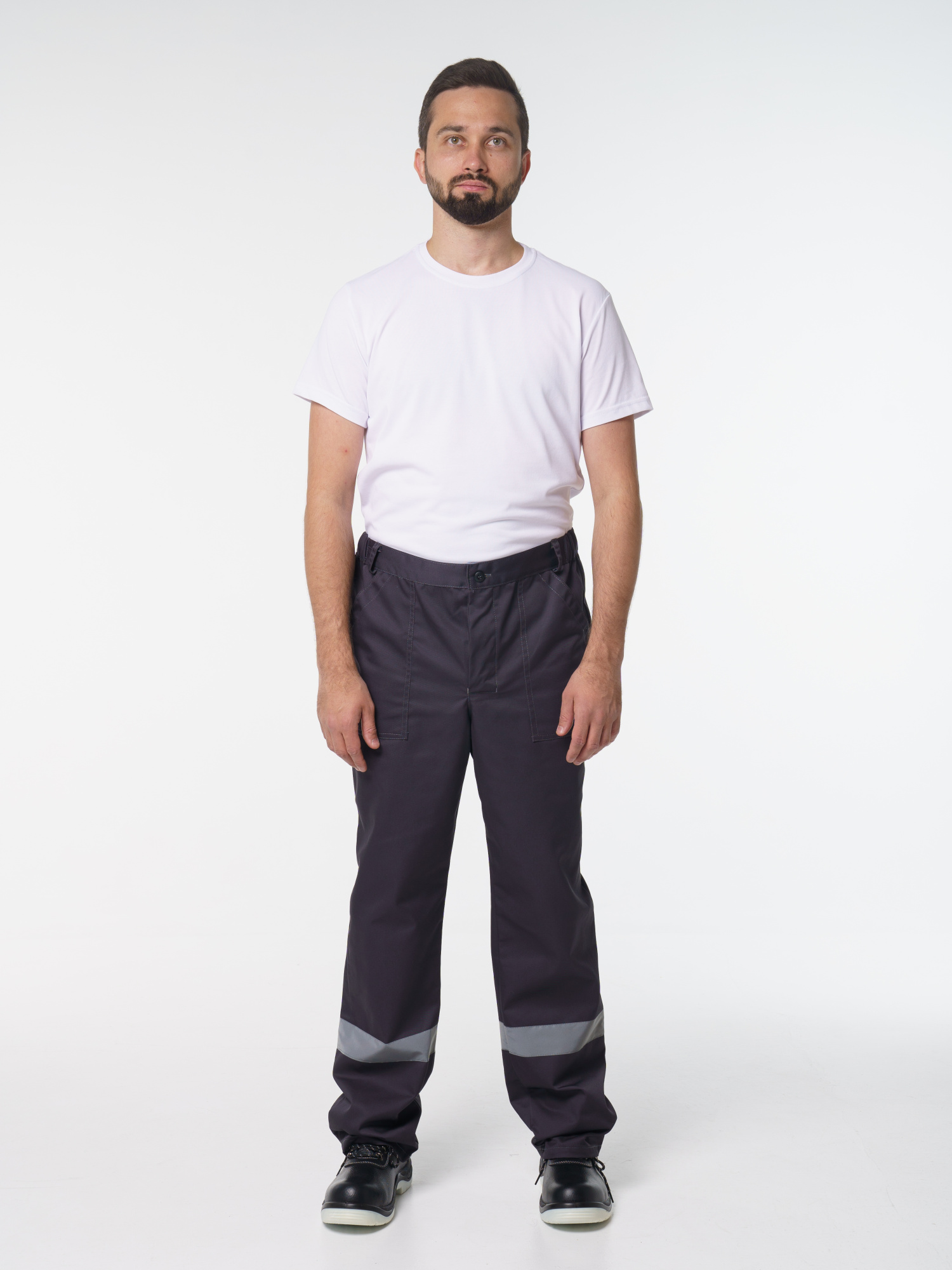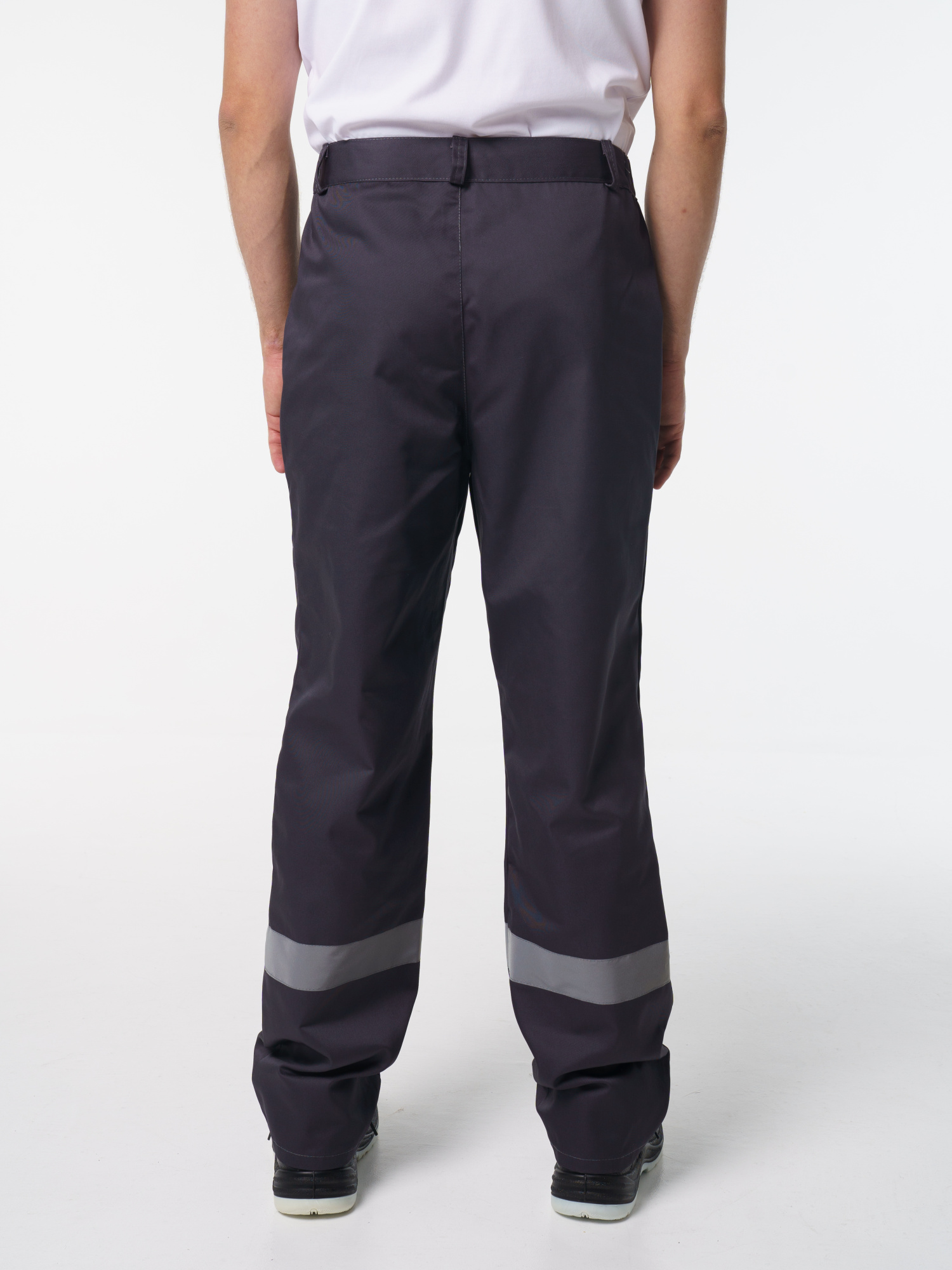 Брюки прямого покроя с притачным поясом, застёгивающимся на одну пуговицу. Пояс регулируется по ширине при помощи резинки по бокам. Изделие с застёжкой гульфика на пуговицы и двумя боковыми накладными карманами с наклонным входом. Есть СОП 50 мм по низу брюк.