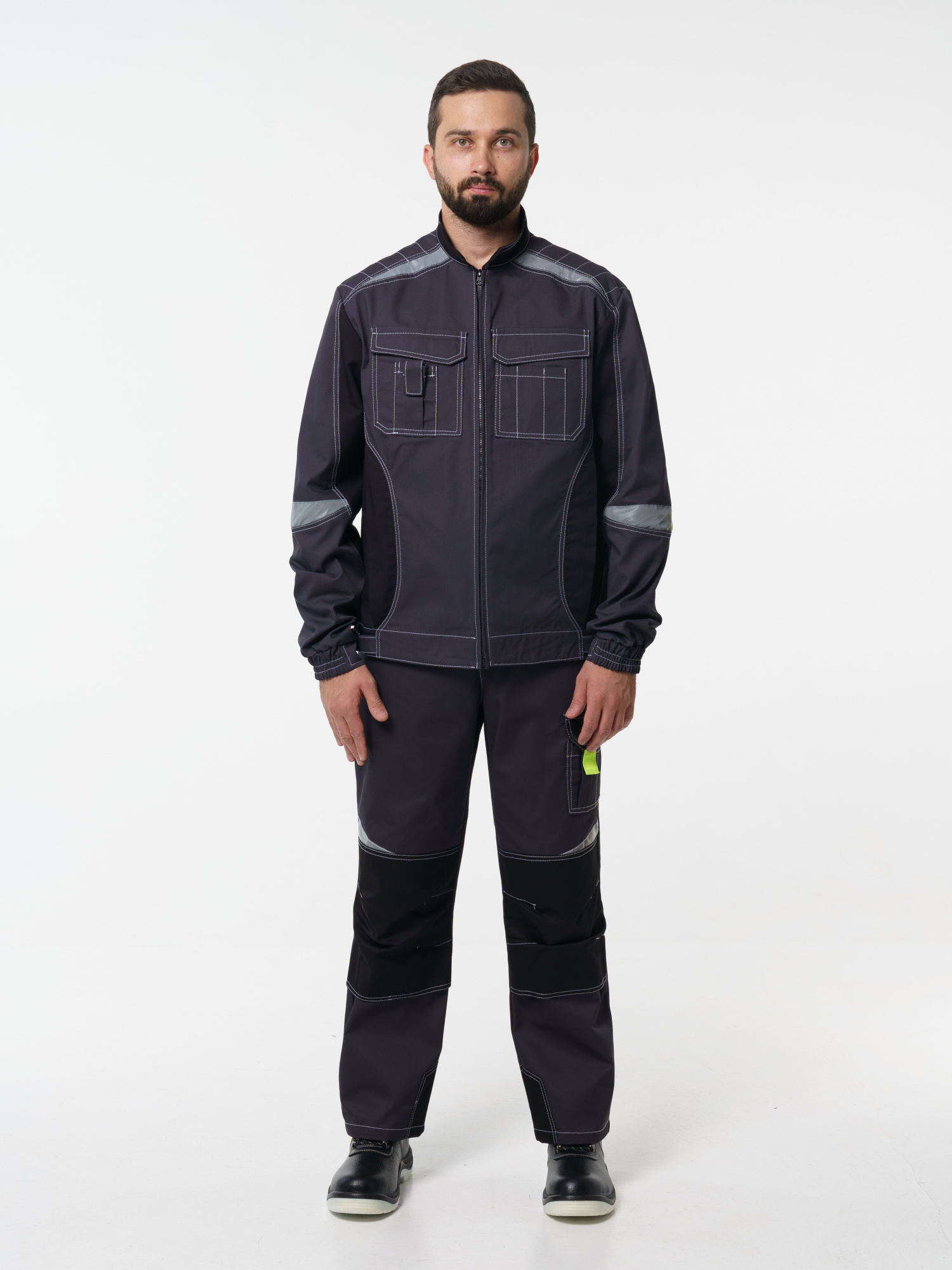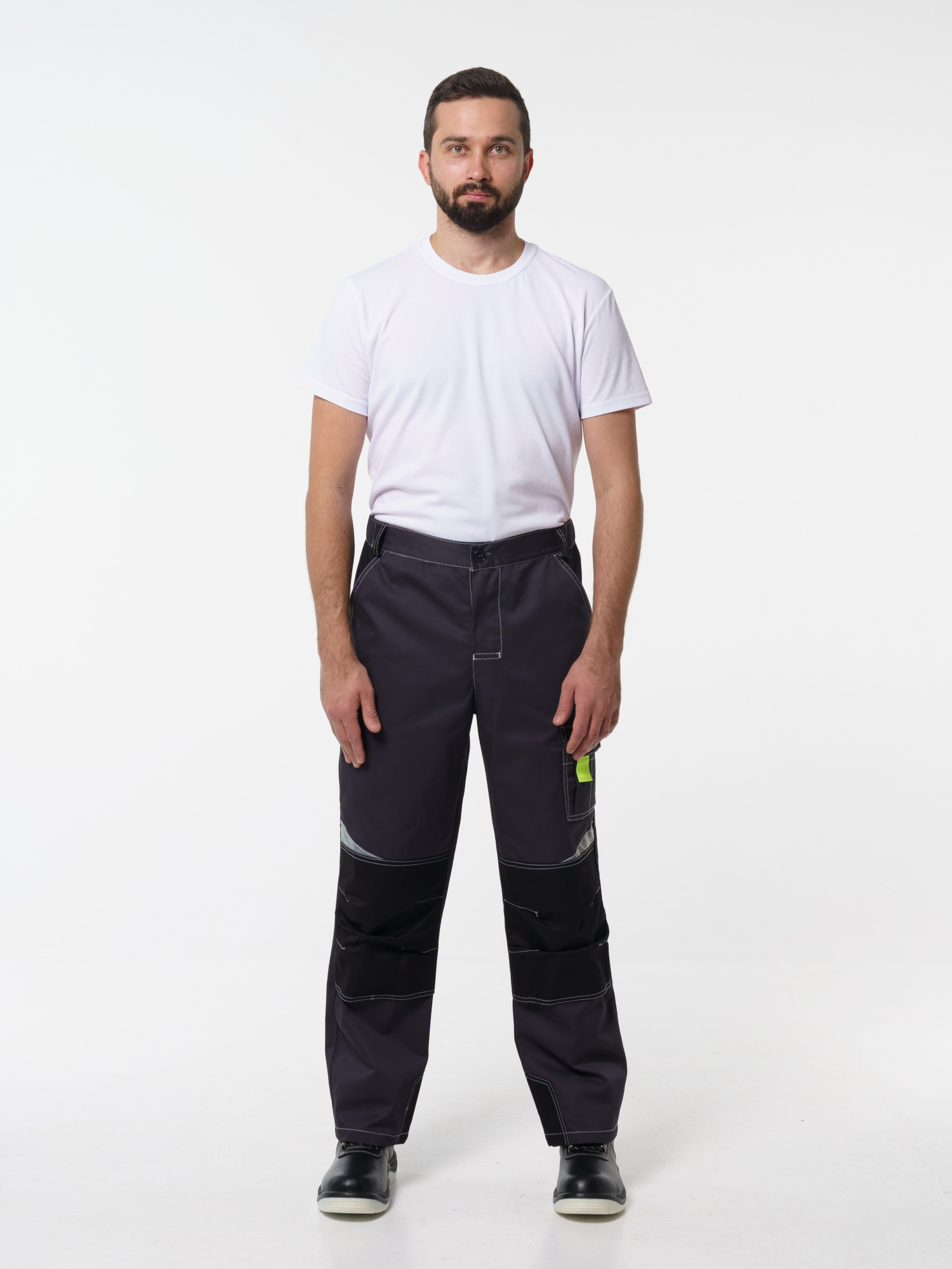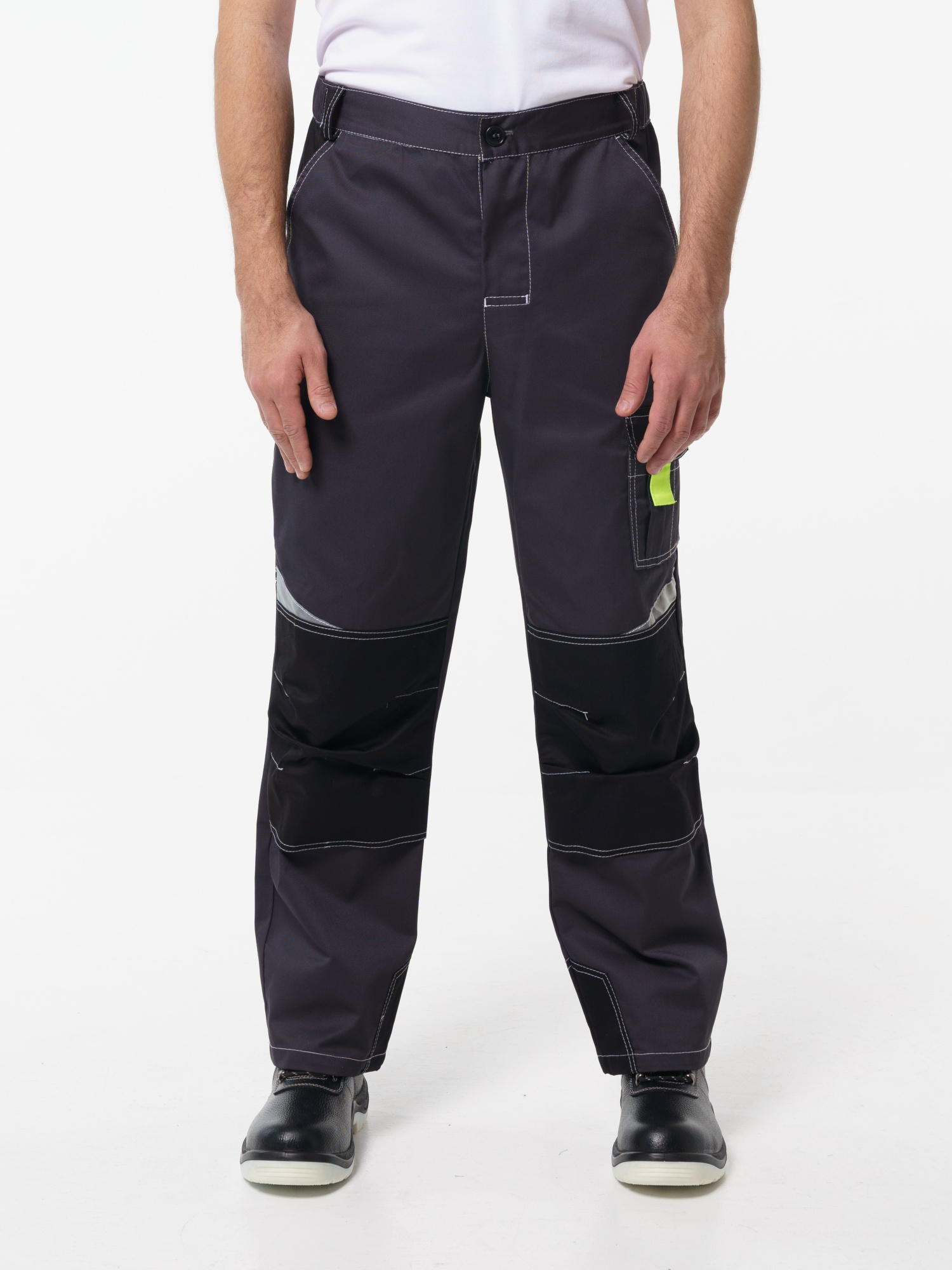Брюки ФАВОРИТ-МЕГА прямые; с застёжкой гульфика на тесьму - «молния»; с застежкой пояса на одну петлю и пуговицу; с боковыми внутренними карманами; с карманами и фигурными клапанами застегивающиеся на потайную липучку на боковом шве; с фигурным карманом на задней половинке; с карманами под инструменты; с наколенниками. Пояс брюк частично стянут резинкой ткацкой по бокам. В брюках предусмотрена лента светоотражающая (мелкодисперсная белая) 50 мм фигурной формы. имеются лимонные отделочные элементы на карманах.
