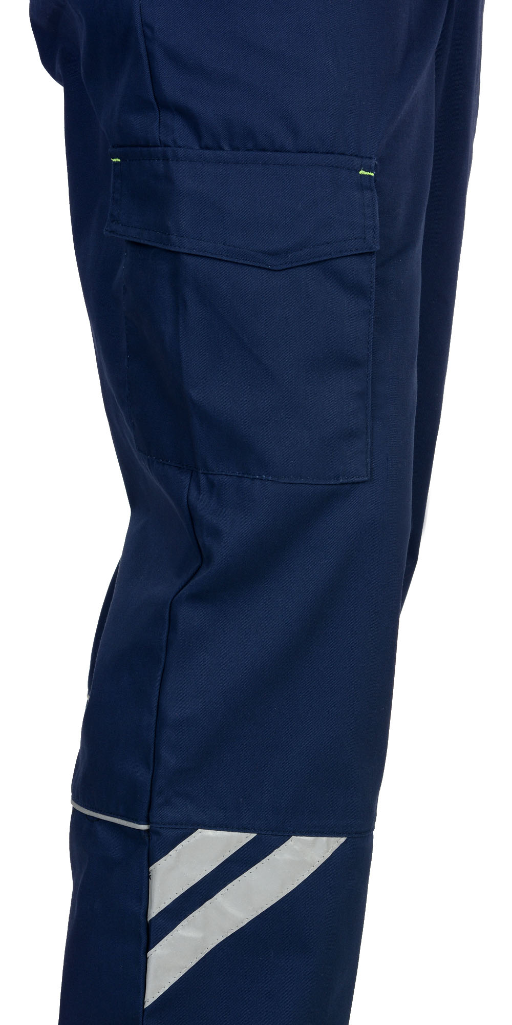 Брюки с притачным поясом с эластичной лентой по боковым швам, застегивающимся на пуговицу, со шлевками, с застежкой гульфика на молнию, с различными функциональными карманами, с элементами из СВ канта и СОП, обеспечивающие безопасность работы в условиях пониженной видимости.