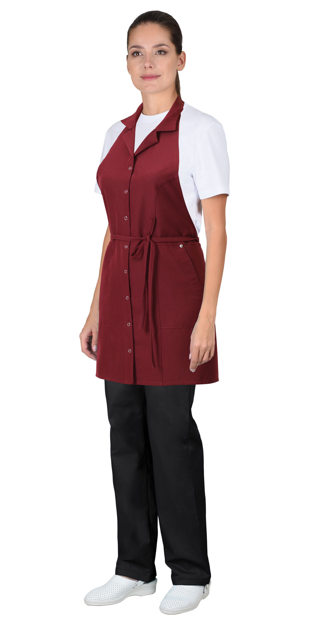 Фартук предназначен для защиты переда и боковых частей работающих от вредных производственных факторов в сфере обслуживания. Фартук с цельновыкроенным нагрудником с центральной бортовой сквозной застёжкой на 8 кнопок и прямой линией низа. Боковые завязки для регулировки фартука на фигуре по объему. Воротник втачной застёгивающийся сзади на 3 кнопки для регулировки фартука по шее. На нижние боковые части фартука настрочены накладные карманы.