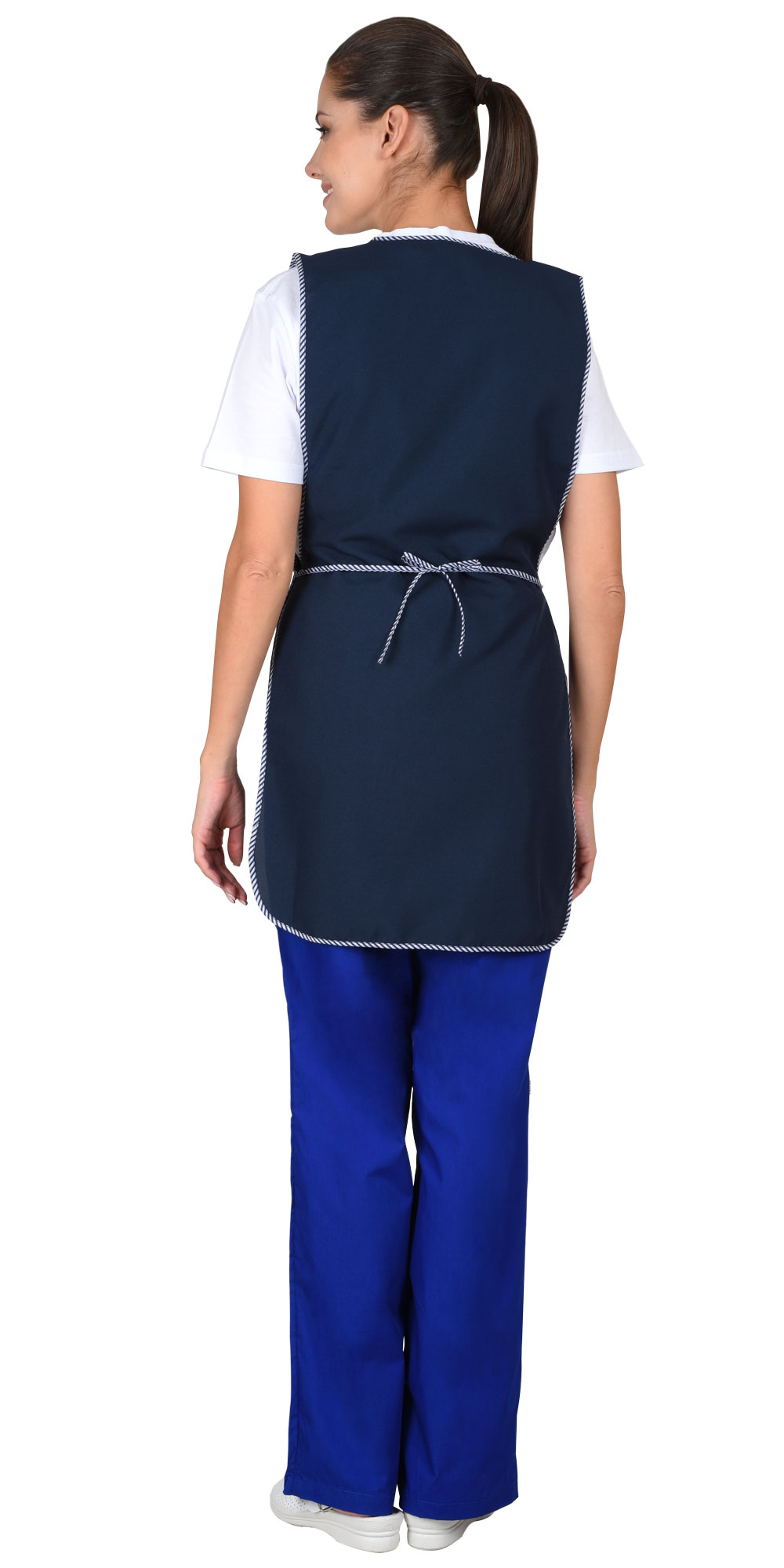 Фартук с круглым вырезом горловины, боковыми завязками для регулировки объема, с большим накладным карманом с зональным делением. Фартук по горловине, верхнему срезу кармана и края окантован окантовочной лентой из отделочной ткани. На фартуке в области кокетки выполнена аппликация.