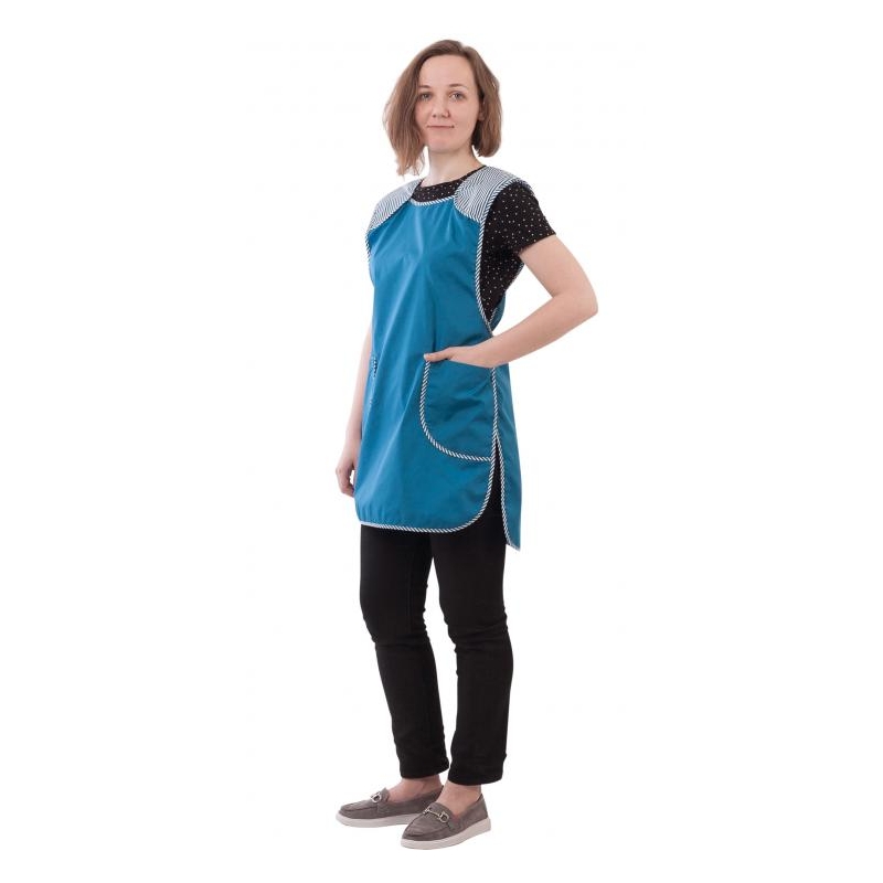 Фартук-сарафан с круглым вырезом горловины, с отрезной кокеткой переходящей с полочки на спину, с боковым завязками с накладными карманами. Отделка краёв и кармана из белой ткани с цветной полоской.