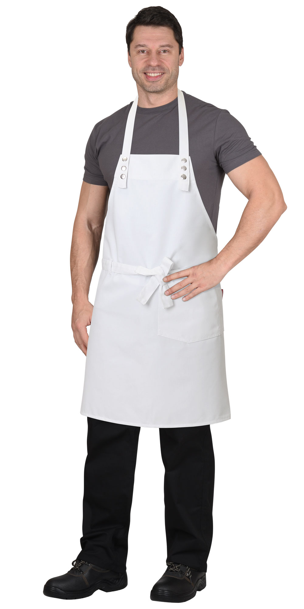 Фартук с нагрудником и с боковыми завязками для регулировки объема. Съёмная шейная бретель, пристёгивающаяся на кнопки. В нижней левой части накладной карман. На правой стороне фартука, на уровне притачивания боковых завязок, шлёвка.