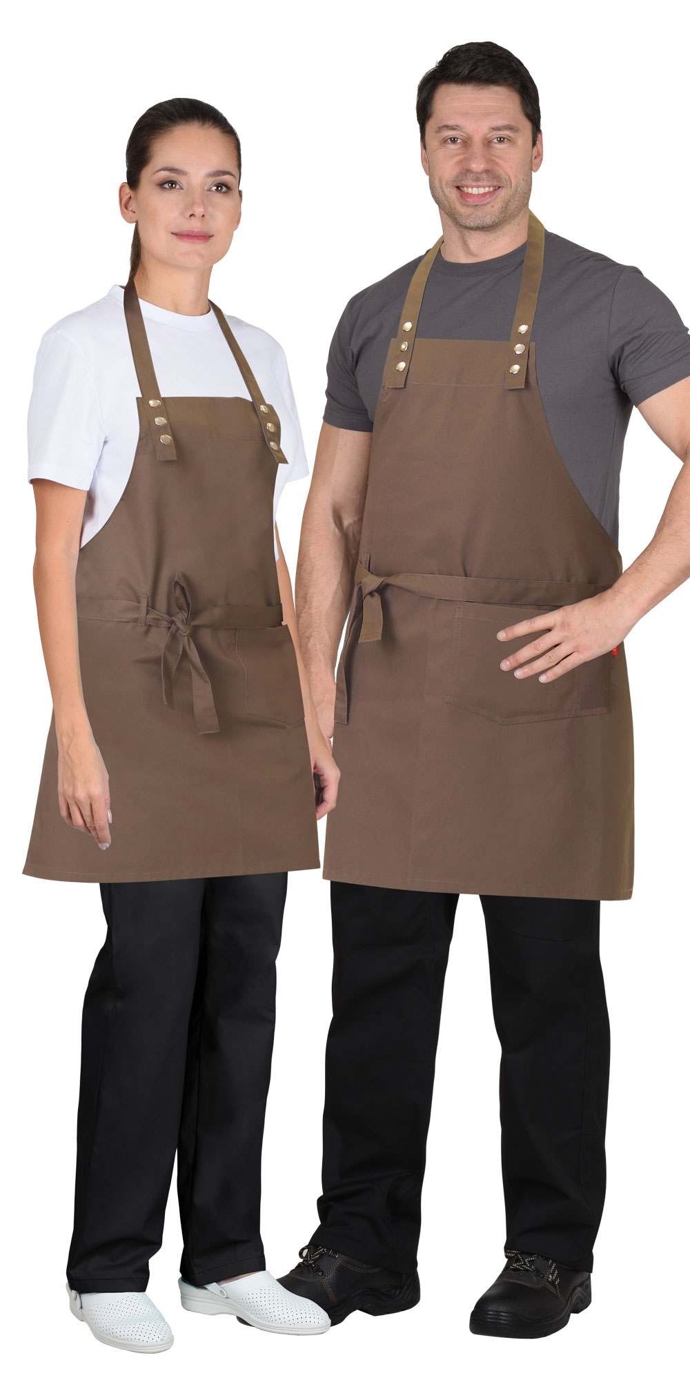 Фартук с нагрудником и с боковыми завязками для регулировки объема. Съёмная шейная бретель, пристёгивающаяся на кнопки. В нижней левой части накладной карман. На правой стороне фартука, на уровне притачивания боковых завязок, шлёвка.