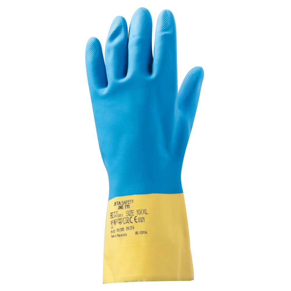 JETA SAFETY JNE711 – защитные перчатки, предназначенные для промышленного использования. Обладают высокой устойчивостью к водорастворимым неорганическим кислотам (до 80%), щелочам (до 40%), солям, спиртам, растворителям. Хлопковое напыление внутри перчатки с антибактериальной обработкой предотвращает раздражение кожи рук.