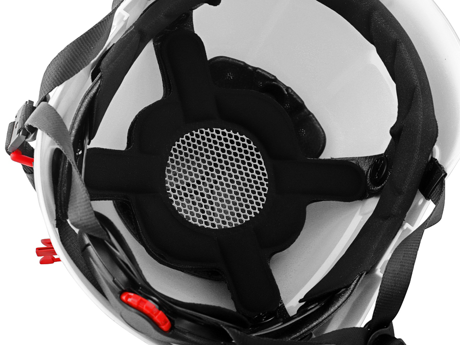 Энергия удара поглощается деформацией корпуса каски. От повреждения острыми предметами темя защищено дополнительным полистирольным вкладышем.