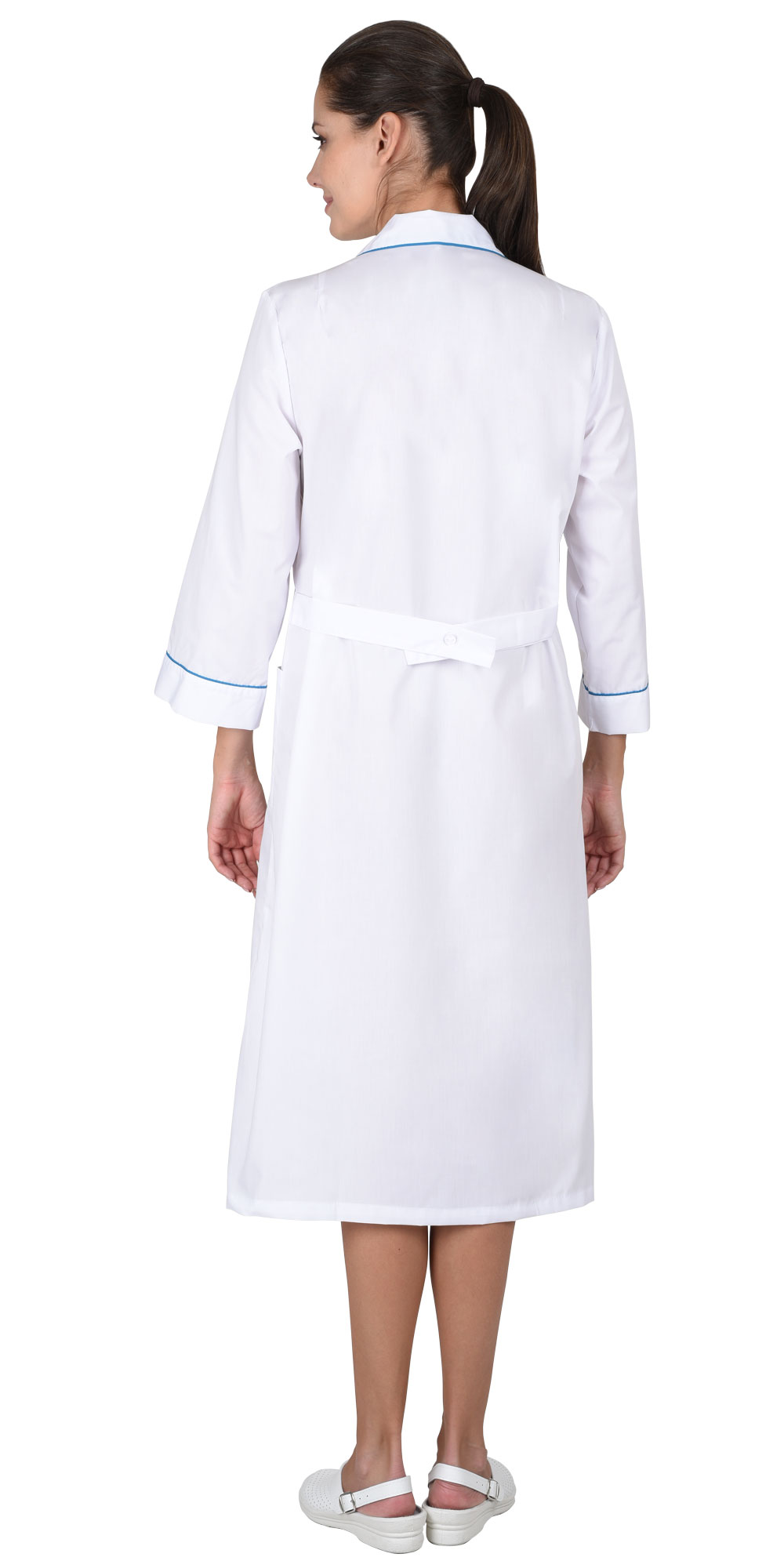 Халат с отложным воротником и нижними накладными карманами, по вороту и манжетам рукавов отделка в виде канта контрастного цвета. Рукава 3/4. Цвет отделки: Бирюзовый.