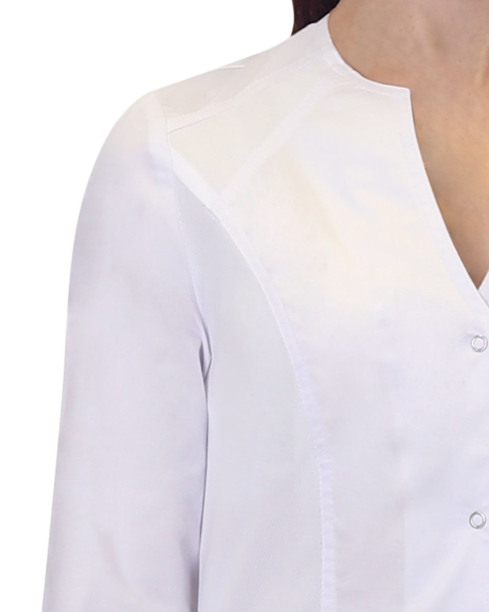 Халат полуприлегающего силуэта с центральной застёжкой на кнопки. Фигурный вырез горловины, без воротника. Рукава втачные, длинной 3/4. Боковые детали халата и два накладных карманы выполнены из трикотажной сетки.