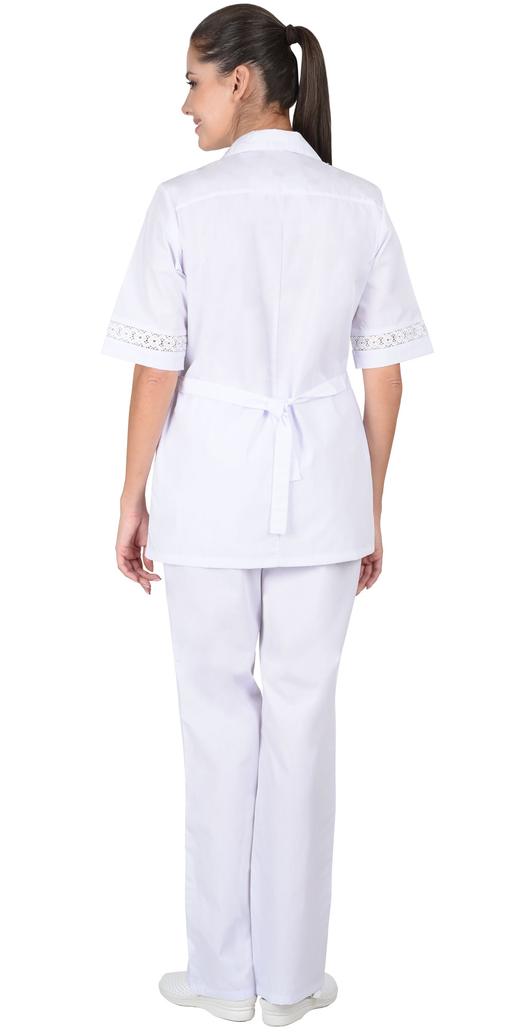 Костюм состоит из блузы и брюк. Блуза полуприлегающего силуэта, с центральной бортовой застежкой на 5 петель и 5 пуговиц, с отложным воротником, с рельефными швами на полочках, с нижними карманами. Рукава короткие. Воротник, карманы, рукава с ажурной отделкой. Ширина блузы по талии регулируется хлястиком. Брюки прямые, с притачным поясом, частично стянутым эластичной лентой по боковым сторонам.