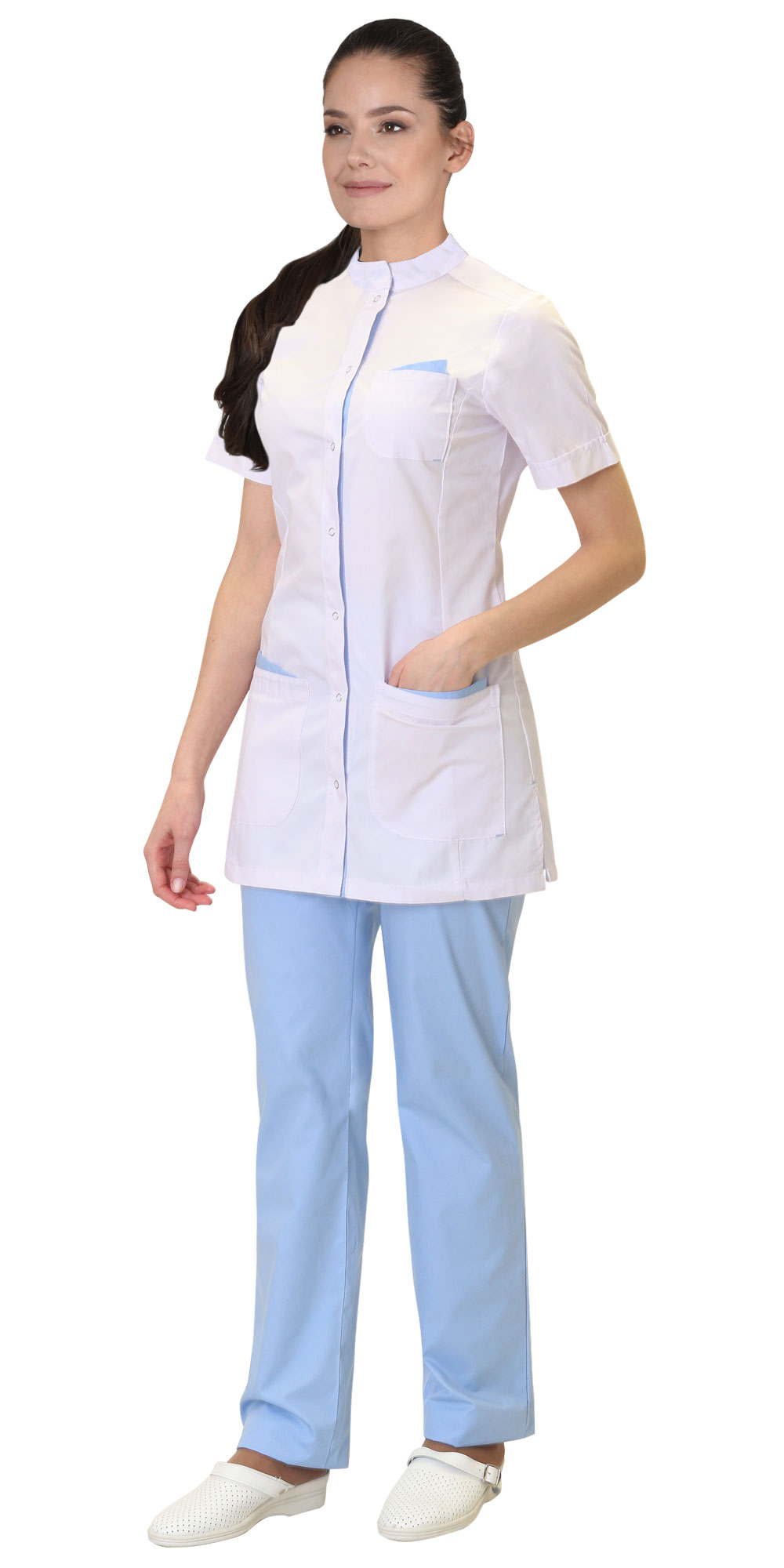Костюм состоит из блузы и брюк. Блуза полуприлегающего силуэта, с центральной сквозной бортовой планкой, застегивающейся на рубашечные кнопки. Воротник «стойка». Рукава втачные, короткие с цельнокроеными манжетами. Полочка с одним верхним и двумя нижними накладными карманами. По верхнему краю карманов выполнена имитация платочка из отделочной ткани в цвет брюк. Брюки прямого силуэта, с заниженной талией, с застежкой гульфика на тесьму "молния", притачным поясом, застегивающимся на пуговицу, частично стянутым резинкой по боковым сторонам. Цвет отделки: Голубой