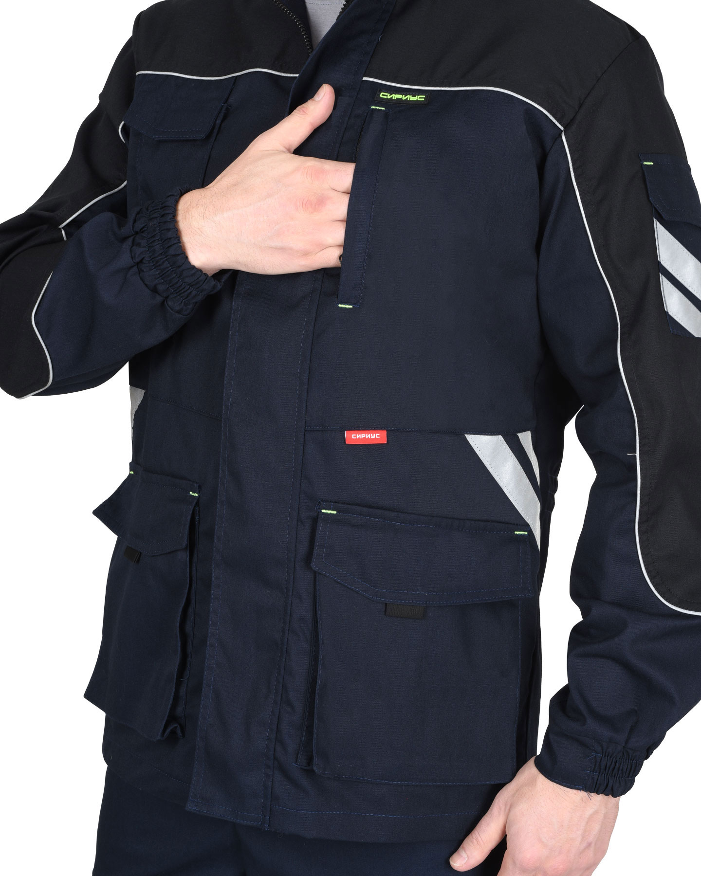 Брюки с притачным поясом с эластичной лентой по боковым швам, застегивающимся на пуговицу, со шлевками, с застежкой гульфика на молнию, с различными функциональными карманами, с элементами из СВ канта и СОП, обеспечивающие безопасность работы в условиях пониженной видимости.