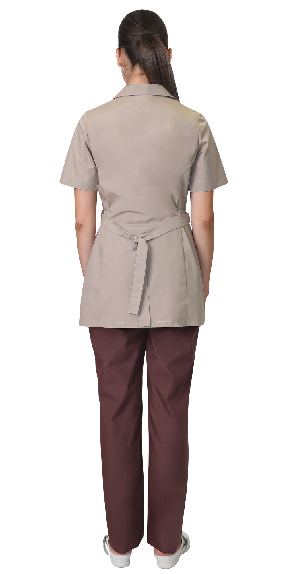 Костюм женский комбинированный из ткани двух цветов состоит из блузы бежевого цвета и брюк шоколадного цвета.