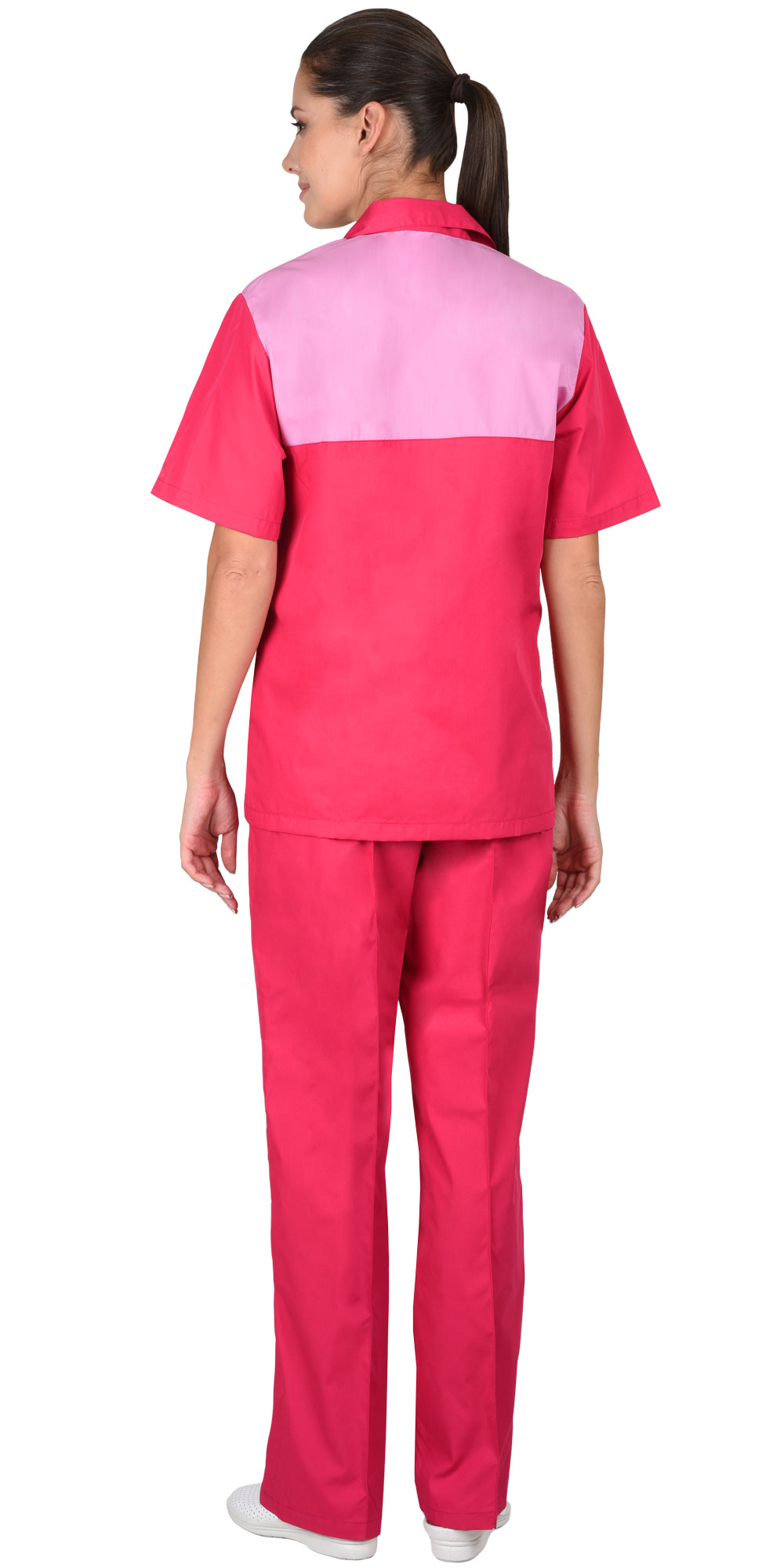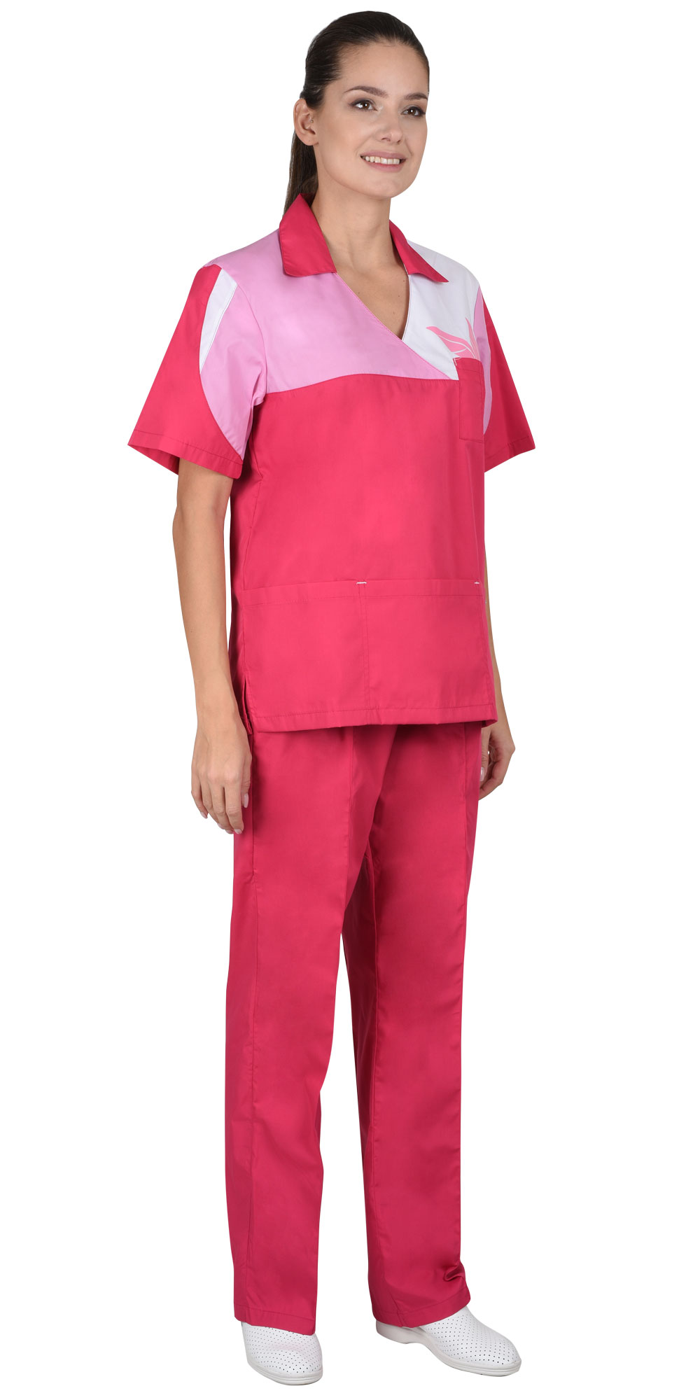 Костюм состоит из блузы и брюк. Блуза прямая с V-образным вырезом горловины и отложным воротником. С нижним накладным большим карманом, разделенным на три. Рукава короткие. Брюки прямые с притачным поясом стянутым резинкой и с отстроченными стрелками.
