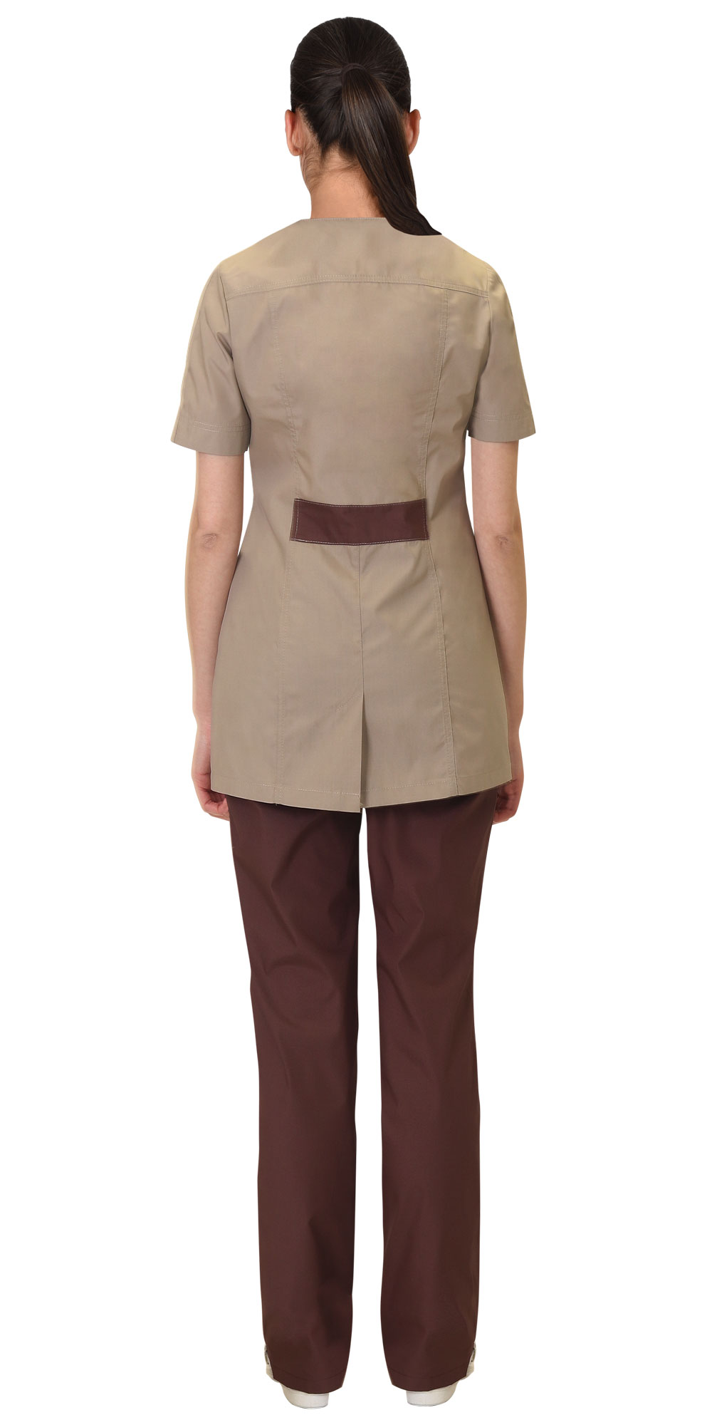 Костюм комбинированный из ткани двух цветов состоит из блузы бежевого цвета и брюк цвета шоколад.