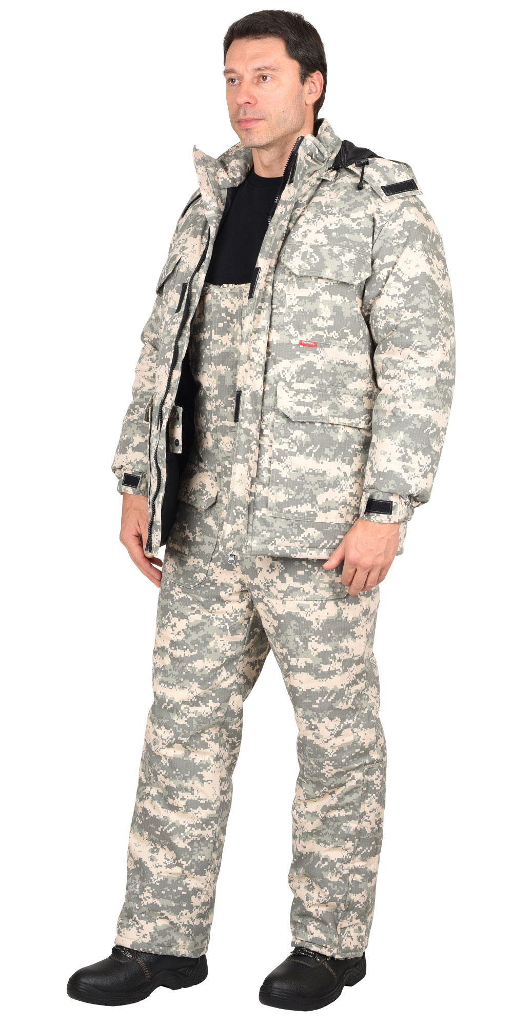 Полукомбинезон прямой с притачной утеплённой подкладкой, с центральной застёжкой на 2-х замковую тесьму-«молнию» и внешним ветрозащитным клапаном, с бретелями.Ткань верха: смесовая "Рип-Стоп", состав: 35 % - х/б., 65 % - п/э, пл. 210 г/м2, расцветка КМФ "Пустыня".Подкладочная ткань: «Таффета Лого», состав: 100 % - п/э.Утеплитель: Синтепон - 150 г/м2, в куртке - 3 слоя (итого 450 г/м2), в п/к - 2 слоя (итого 300 г/м2.)