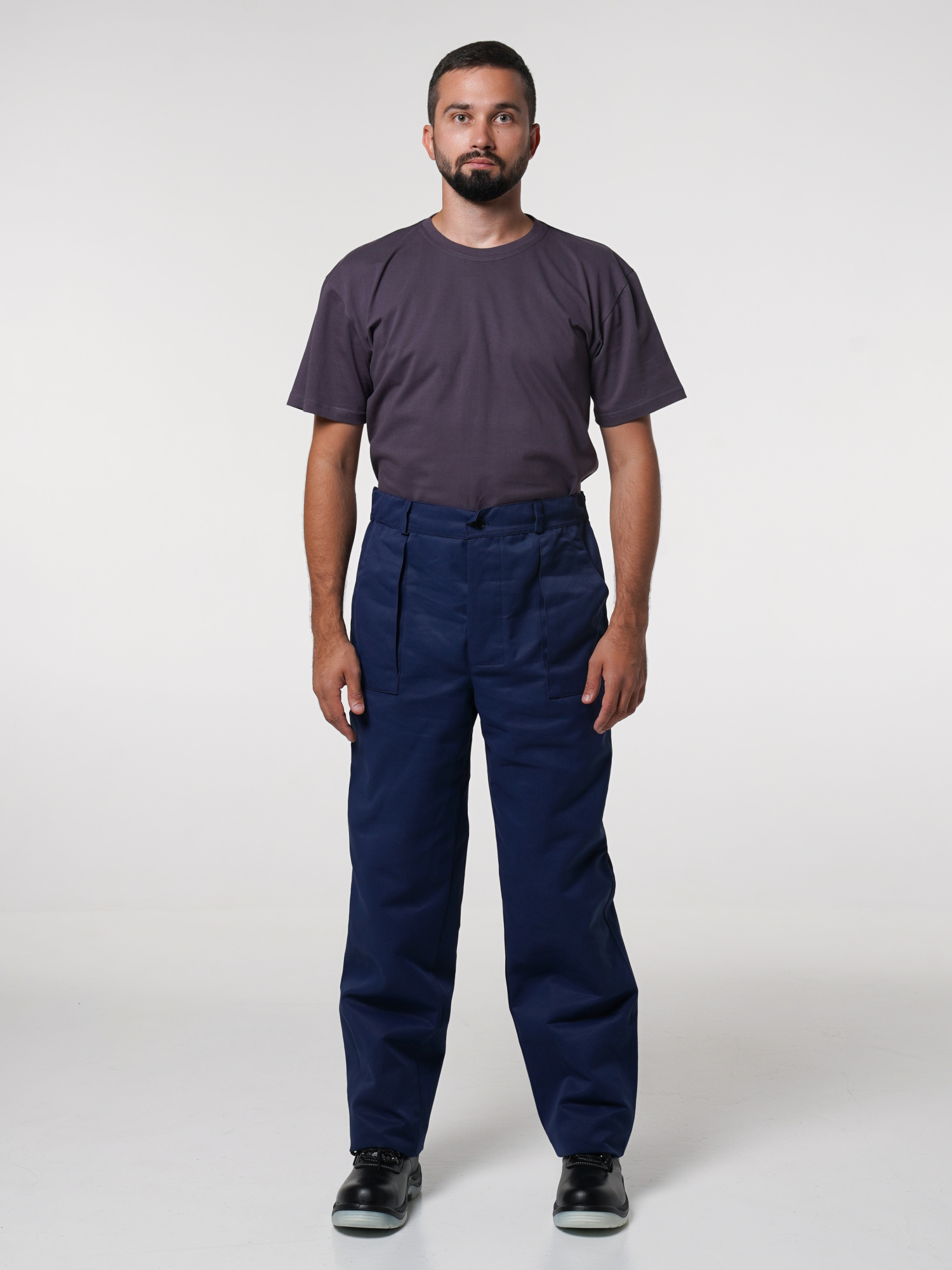 Брюки с притачным поясом, застегивающимся на петлю и пуговицу, с пятью шлевками, с застежкой-гульфиком на молнии.
