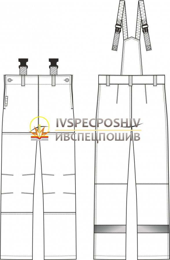 Задние половинки брюк с вытачками, состоят из двух частей: верхней и нижней. На нижних частях задних половинок брюк расположена световозвращающая полоса шириной 5 см. Задние половинки с притачной спинкой, с бретелями, пристегивающимися на защелку-трезубец. Длина бретелей регулируется «открытой» эластичной лентой