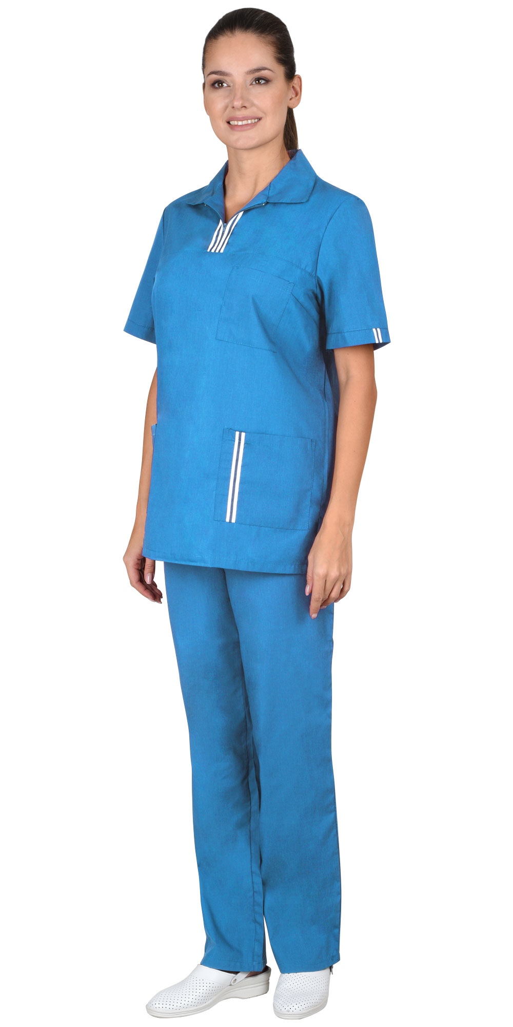Костюм состоит из блузы и брюк. Блуза прямого силуэта с застежкой на тесьму "молния" в области кокетки. Отложной воротник. Нагрудный левый и два нижних накладных кармана. Рукава втачные, короткие. По низу блузы разрезы в боковых швах.