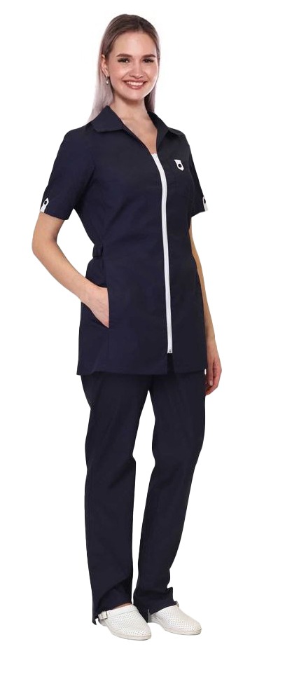 Современный удобный женский костюм со свободной посадкой, рекомендован для сферы косметологии и работников медицинских учреждений из высококачественной смесовой ткани прекрасно переносят многократные стирки и выглядят презентабельно даже при длительных сроках эксплуатации. Широкий размерный ряд продукции позволит без труда подобрать костюм правильно по фигуре, в соответствии со спецификой профессии и с учетом индивидуальных требований сотрудника. Костюм женский «Глория 2» для косметологов и медработников прост в уходе, не мнется и быстро сохнет, а материал долгое время сохранит свой первоначальный яркий цвет. Костюм состоит из блузы и брюк темно-синего цвета с белой отделкой. Сегодня современная мода вмешивается не только в подиумные и уличные образы. Она диктует свои правила разным сферам жизни, в том числе в сфере косметологии и медицине. Костюм состоит из прочной смесовой ткани ТИСИ, отталкивающей различного рода загрязнения. Материал устойчив к пятнам и истиранию, тем самым косметологи и медработники всегда будут выглядеть опрятно и привлекательно.