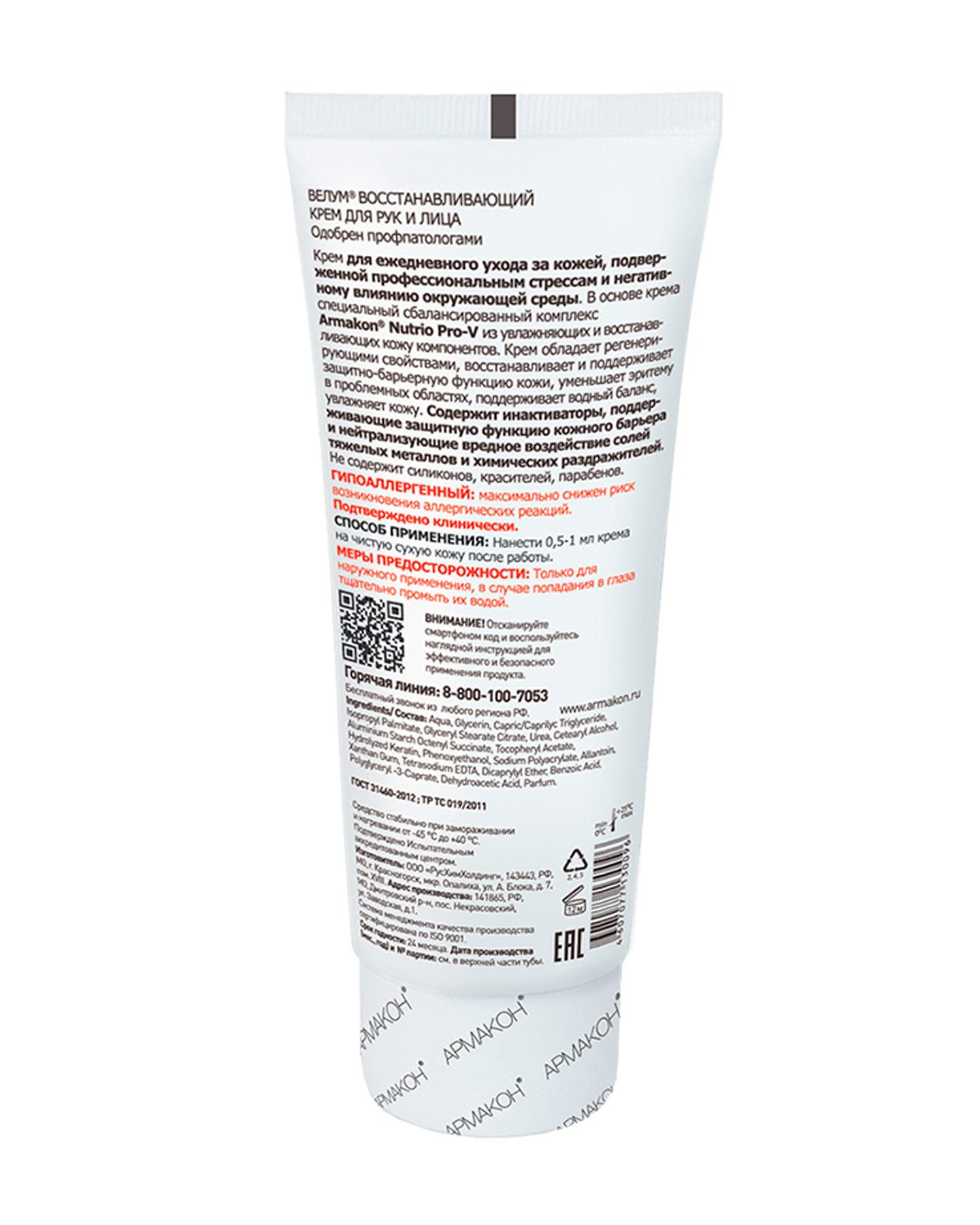 Благодаря наличию в составе специального питательного комплекса Armakon® Nutrio Pro-V, ВЕЛУМ® успокаивает и смягчает кожу, помогает в полной мере восстановить целостность кожного покрова после работы с агрессивными материалами и веществами и негативного влияния окружающей среды.
