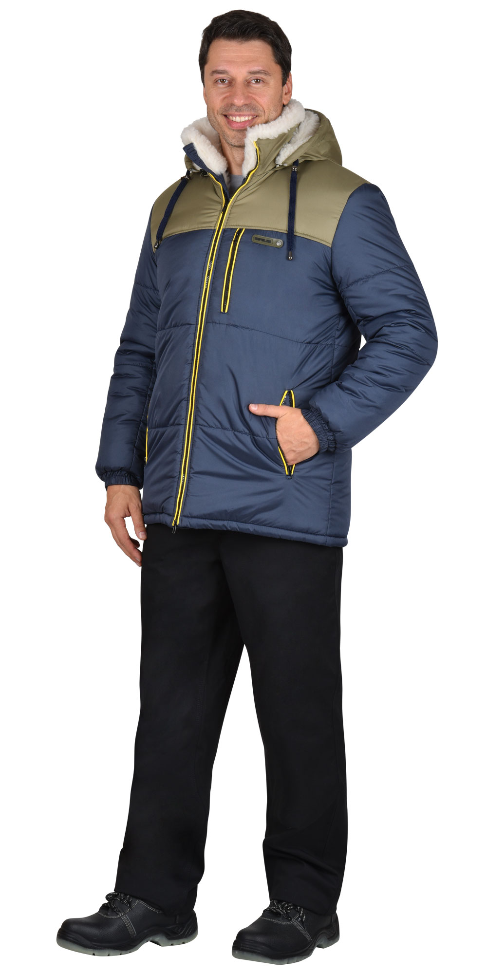Куртка мужская; прямого силуэта с притачной подкладкой из искусственного меха; с центральной застёжкой на двухзамковую молнию; с воротником-стойка; с утепленным пристегивающимся капюшоном; с прорезными карманами в области груди левой полочки и нижними застегивающимися на молнию, с контрастным кантом с наполнителем. ГОСТ 25295-2003