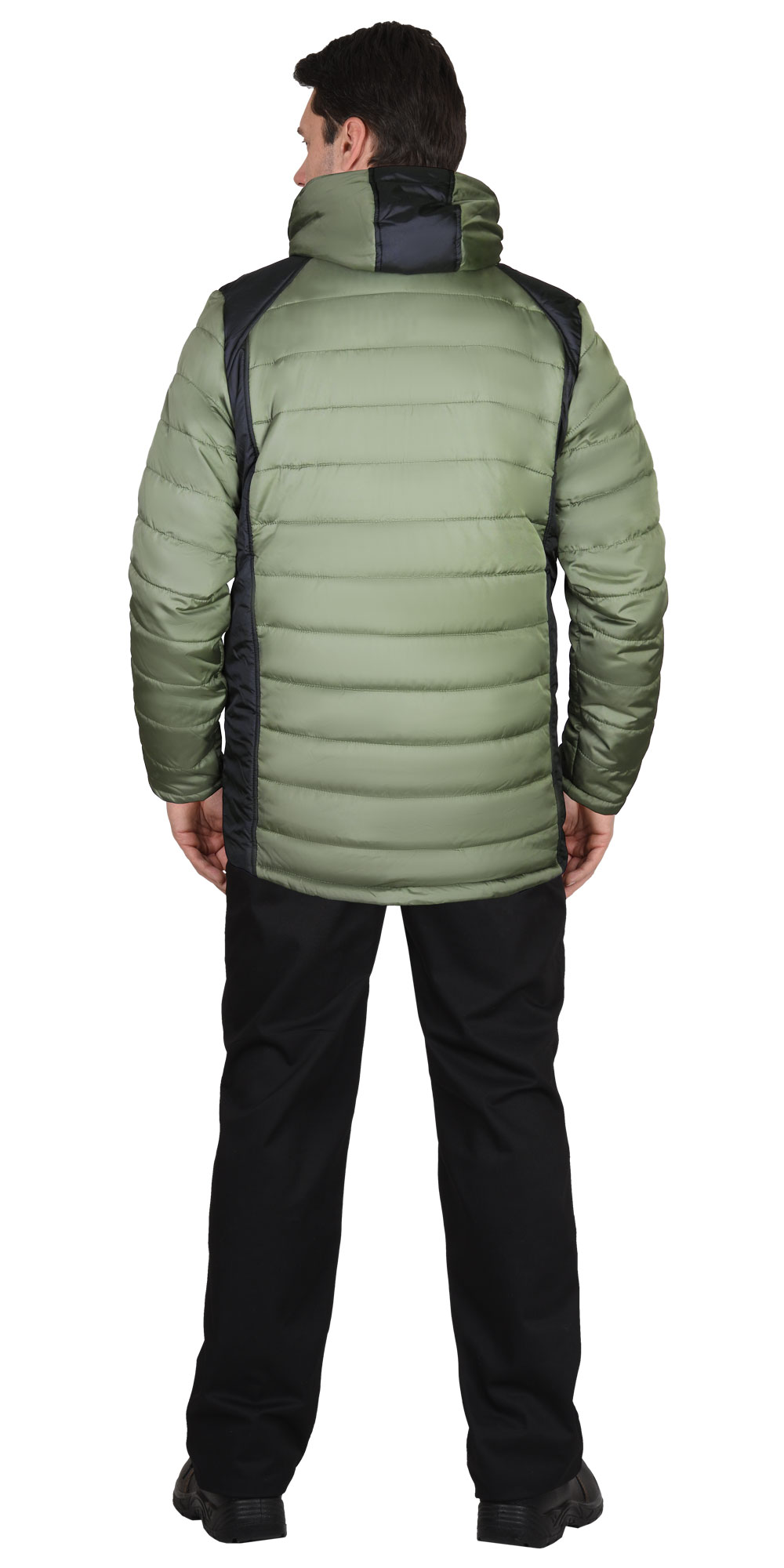 Куртка комбинированная из ткани двух цветов, с центральной застежкой на молнию, с удлиненной фигурной линией низа по спинке, с втачным капюшоном, с втачными рукавами. Куртка с левым нагрудным прорезным карманом на молнию, нижние карманы в швах. На подкладке с правой стороны накладной карман на молнию.