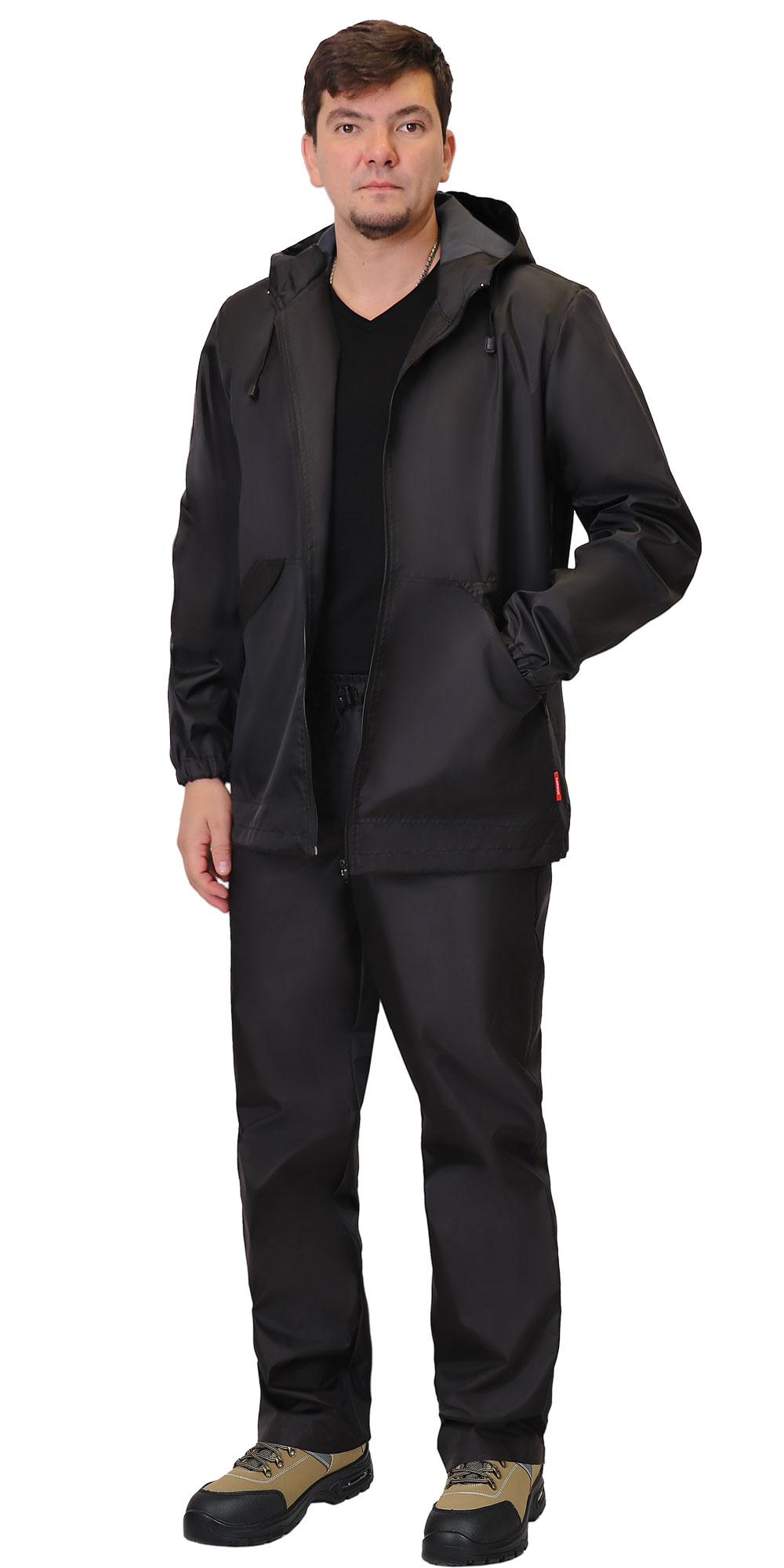 Куртка из полиэфирной водоотталкивающей ткани, с застёжкой на молнию, с капюшоном, с большими накладными карманами с наклонным входом, низ рукавов собран на резинку, объём куртки понизу и объём капюшона по лицевому вырезу регулируются эластичным шнуром с фиксаторами.