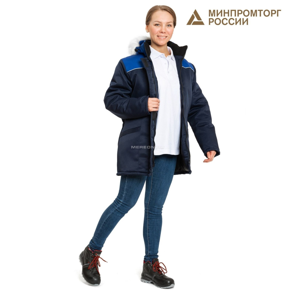 Куртка удлиненная, с рельефами на полочках. Центральная застежка на молнию, закрытую ветрозащитным клапаном на «липучках». Воротник - стойка, внутри выполнен из флиса. Боковые карманы - внутренние, на молнии. Рукава -втачные, внутри имеют трикотажные напульсники. По кокеткам спинки и полочек втачан светоотражающий кант. Ширина по линии талии регулируется резинкой. Утепленный капюшон пристегивается при помощи молнии и отделан по лицевому вырезу искусственным мехом.