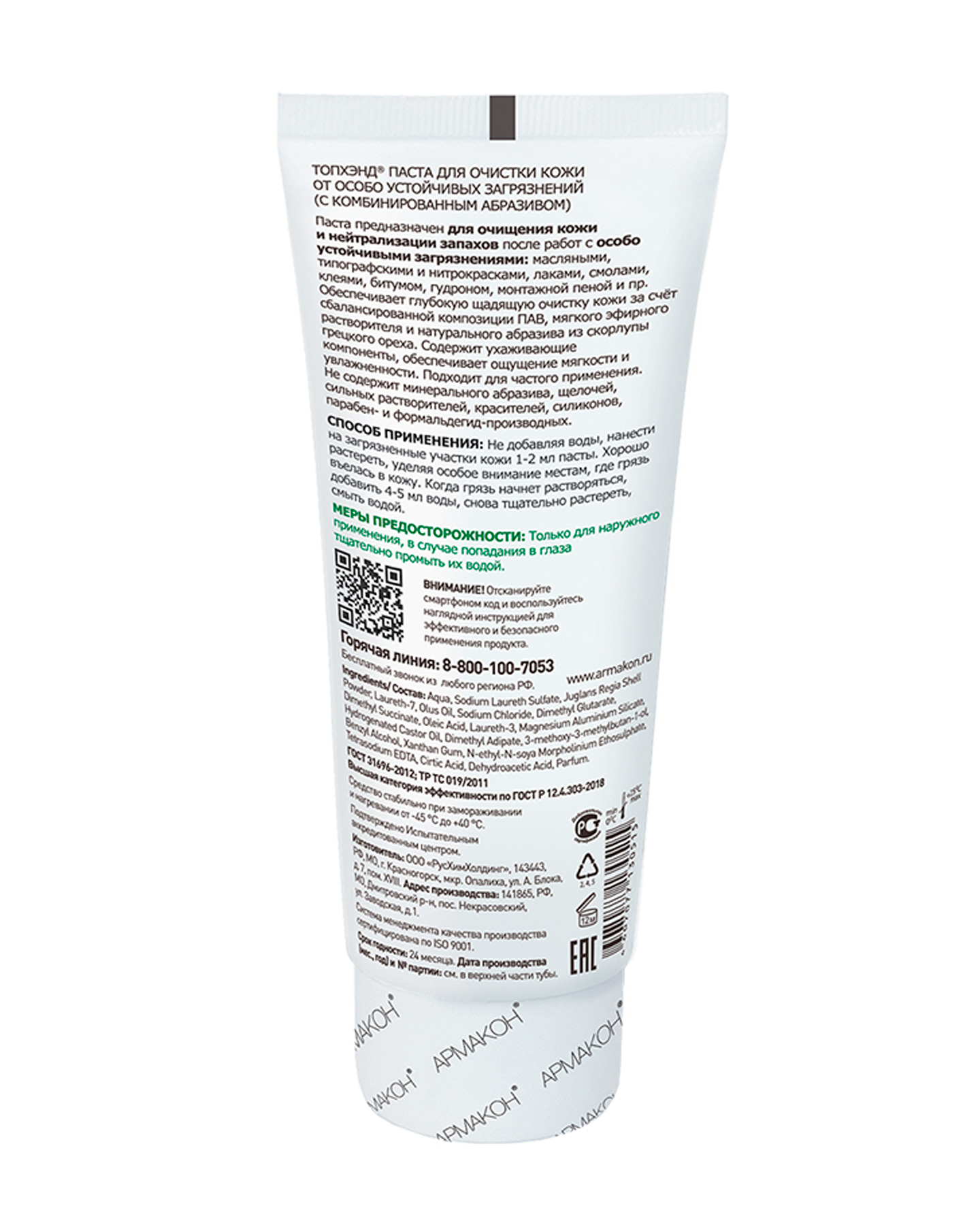 Паста с комбинированным абразивом из скорлупы грецкого ореха предназначена для очистки кожи от особо устойчивых загрязнений (масляные, типографские и нитрокраски, лаки, смолы, клей, битум, монтажная пена и пр.) ТОПХЭНД® обеспечивает глубокое щадящее очищение кожи за счет сбалансированной комбинации ингредиентов.