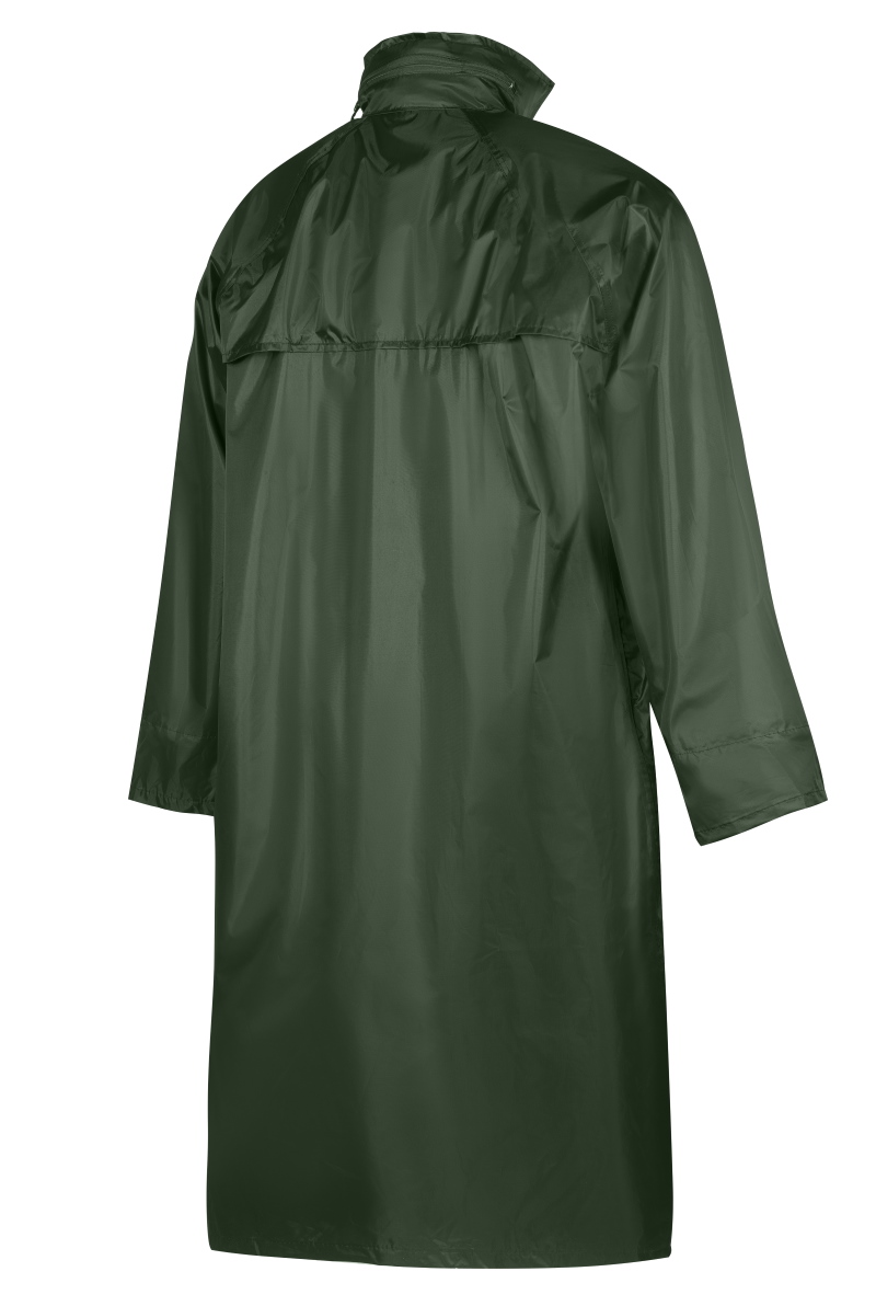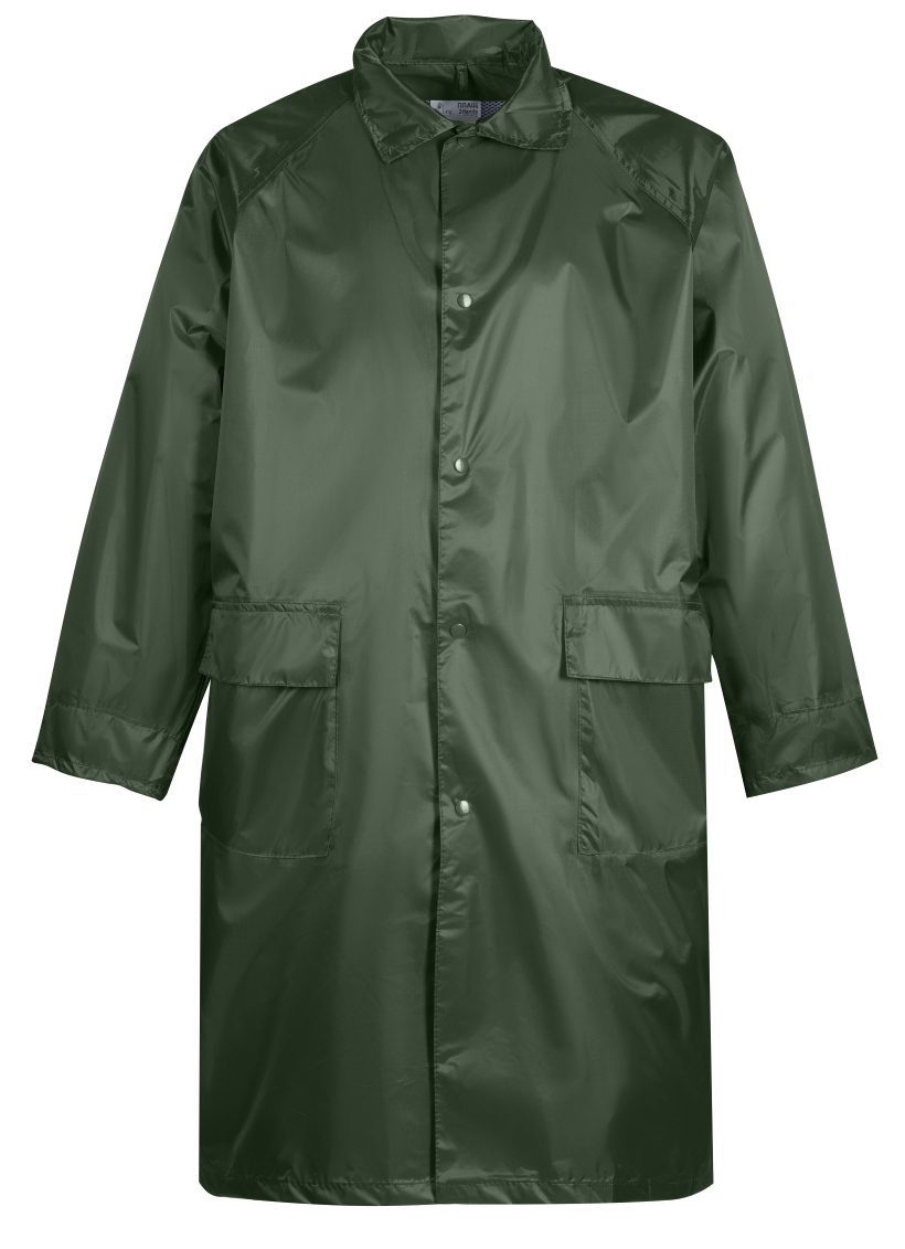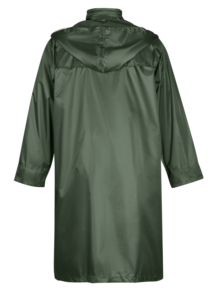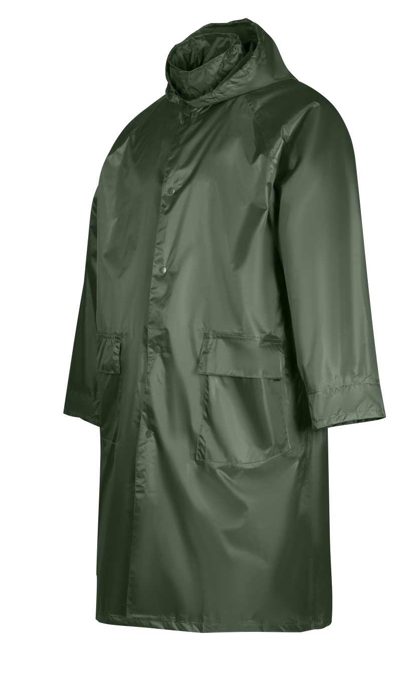 Влагозащитный плащ для защиты от атмосферных воздействий: дождя, ветра, пыли. Плащ с капюшоном (прячется в воротник на молнии), вентиляционными отверстиями под рукавами и по спинке (с сеткой), двумя карманами под клапанами, застежка на двойной ряд кнопок + двойная планка, муфты в рукавах, поставляется в индивидуальной многоразовой упаковке. Используемая конструкция застежки является наиболее надежной для плаща, так как при значительной длине  застежки присутствует риск преждевременной поломки застежки-молнии, а при поломке одной или нескольких кнопок, изделие можно продолжать использовать. Плащ поставляется в индивидуальной многоразовой упаковке. Материал - ПВХ усиленный полиэстером (полиэстеровыми волокнами- нитями) с толщиной листа -0,18 мм, все соединения проклеены ПВХ лентой,  цвет зеленый. Рекомендуется для использования поверх верхней одежды в дождливую погоду во всех отраслях промышленности, на транспорте и сельском хозяйстве  Размеры "европейские", соответствуют стандартам РФ: L, XL, 2XL,3XL