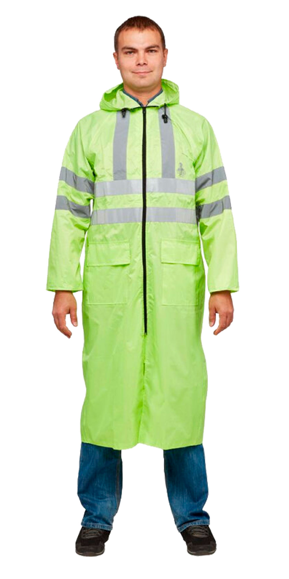 Влагозащитный плащ повышенной видимости с капюшоном и двумя карманами с клапанами.
