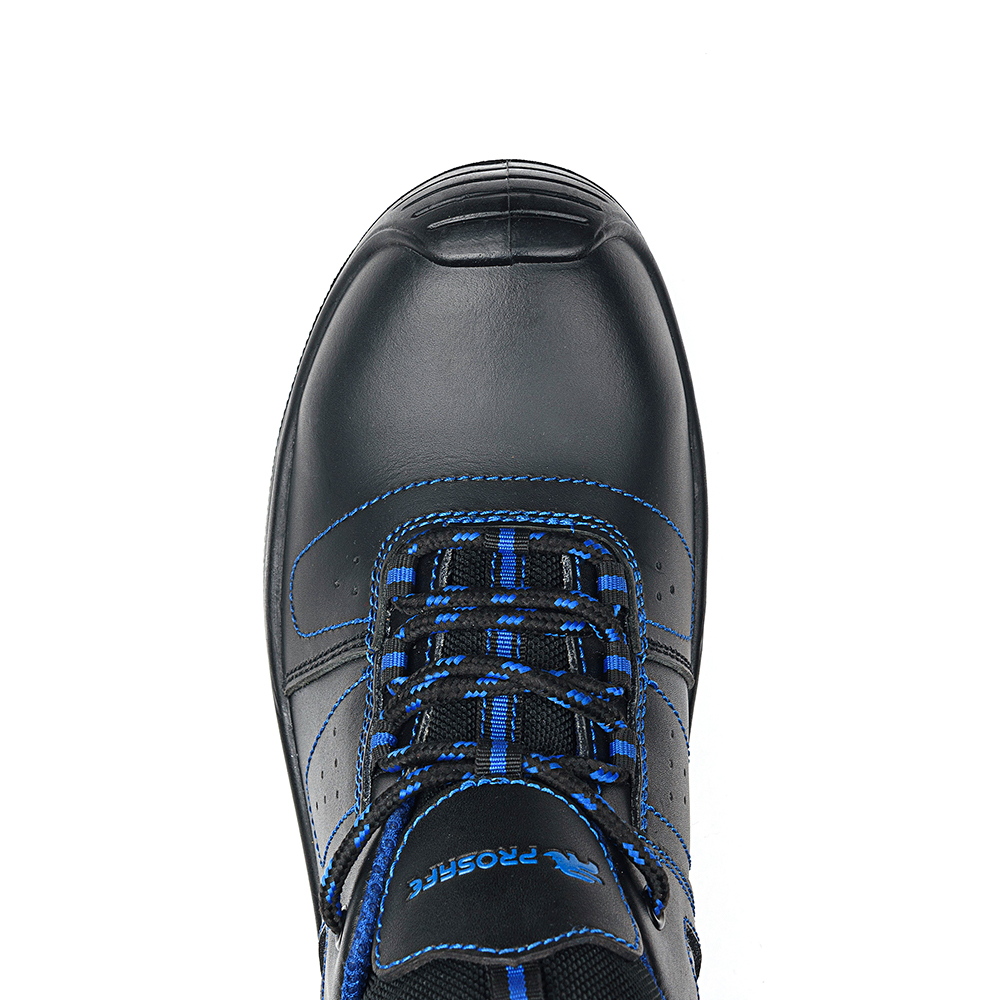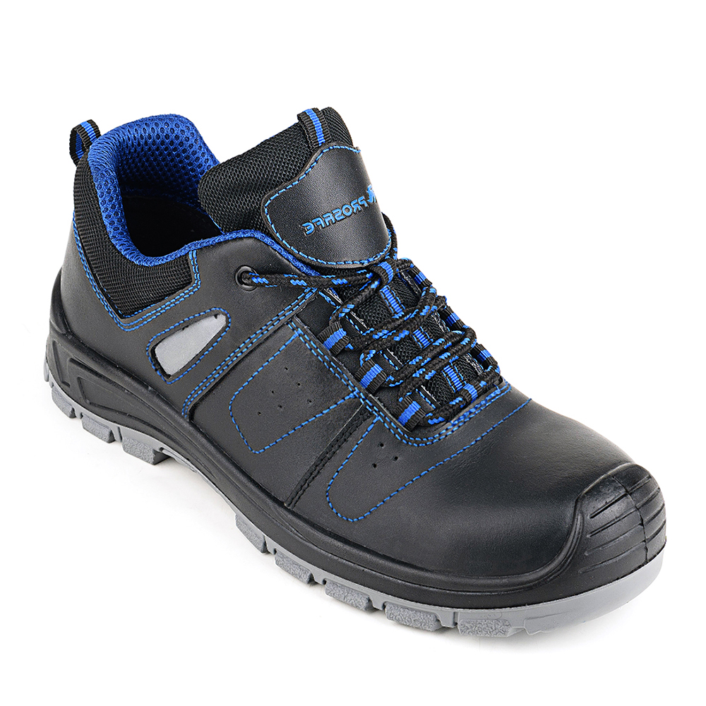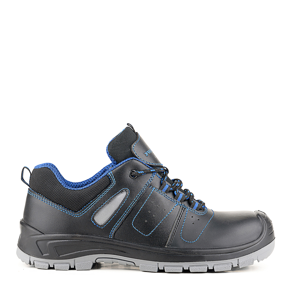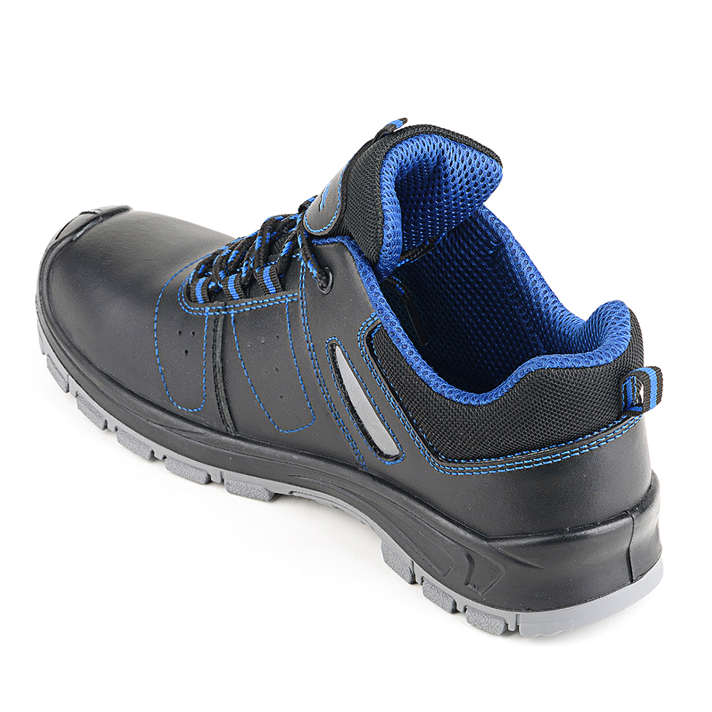 Полуботинки изготовлены с помощью литьевого способа крепления подошвы. Верх ботинок выполнен из натуральной кожи, толщиной 1,6-1,8 мм, со световозвращающими элементами для лучшей видимости работника в условиях недостаточной освещенности. В верхней части имеется мягкий кант. Полуботинки фиксируются на ноге с помощью шнуровки, проходящей чекрез текстильные петли и металлическую блочку в верхнем ряду. Подкладка выполнена из текстильного сетчатого материала. Стелька вкладная. В носочной части внутренний защитный композитный подносок ударной прочностью 200 Дж. Также на данной модели в передней и боковых частях имеются вентиляционные отверстия. Глубина профиля ходового слоя составляет 3 мм. Цвет полуботинок - черный, с контрастной синей отстрочкой.