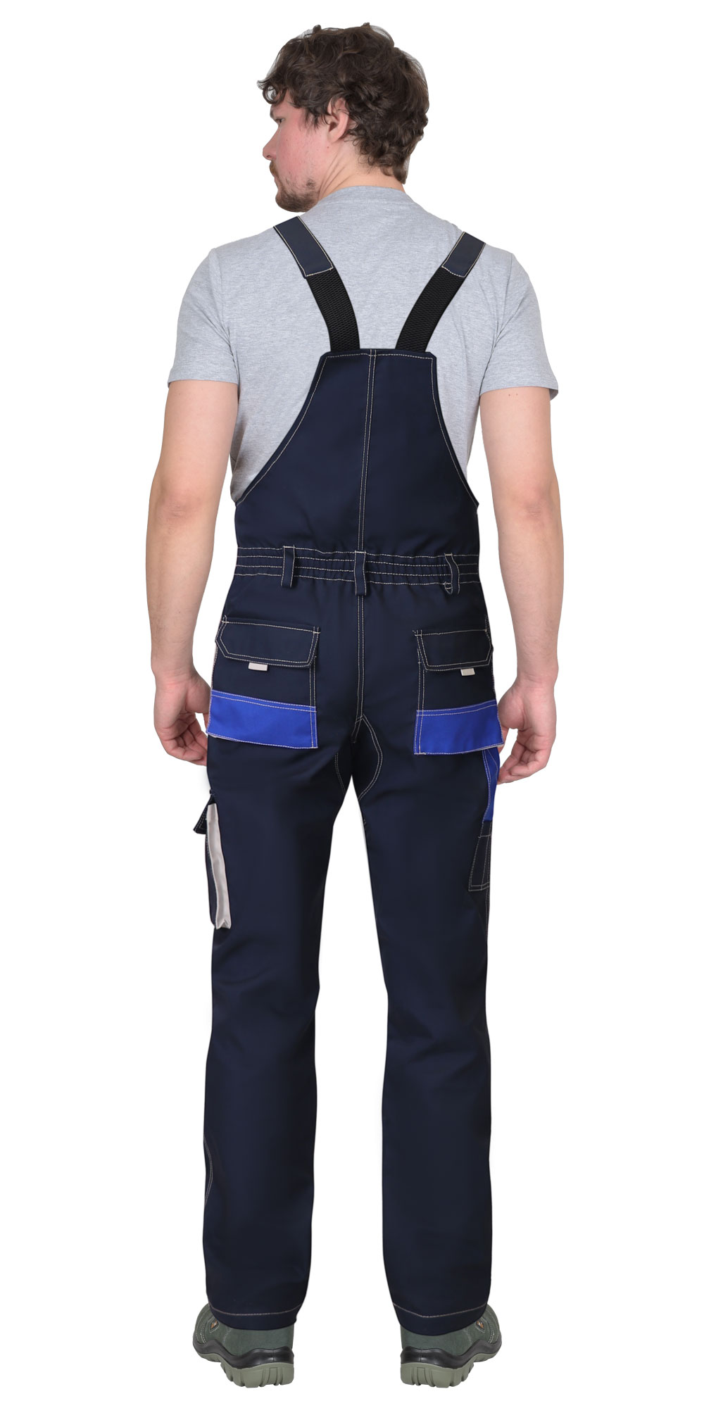 Полукомбинезон с застёжкой спереди - гульфик с молнией и с застёжкой в правом боковом шве на пуговицы, с наколенниками, с бретелями. Полукомбинезон спереди и сзади с накладными карманами. Спереди с нагрудным карманом с клапаном, на липучке. Сзади полукомбинезон по талии стянут резинкой для лучшего прилегания по фигуре. Бретели с резинкой, длина бретелей регулируется при помощи металлической пряжки.