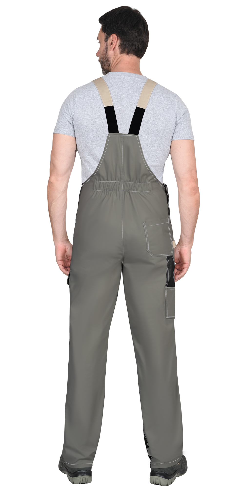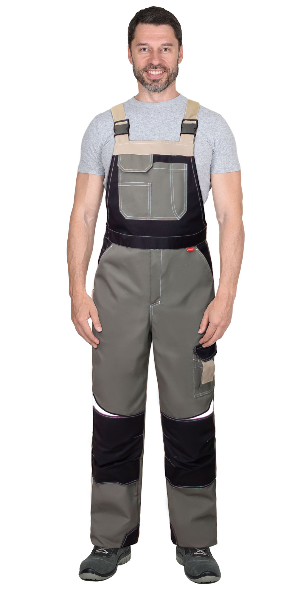 Полукомбинезон прямой с застёжкой спереди - гульфик с молнией и с застёжкой в правом боковом шве на пуговицы, с отрезной грудкой, с бретелями, с боковыми внутренними карманами на передних половинках, с накладными карманами на правой задней половинке и на левом боковом шве, с наколенниками. Бретели регулируются при помощи застежек-фастексов и резинки. В полукомбинезоне предусмотрены светоотражающие элементы, для обозначения сигнальной видимости.
