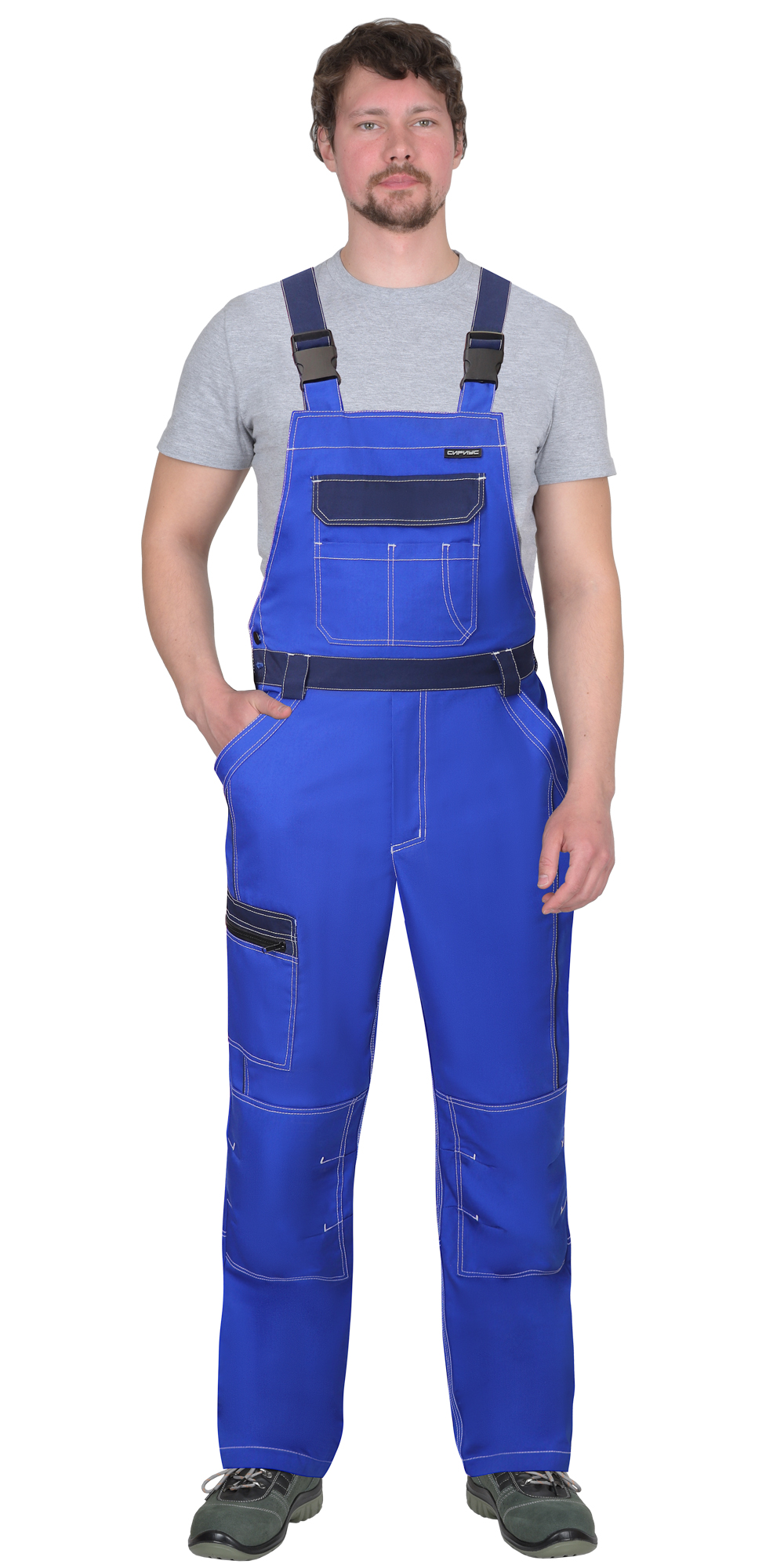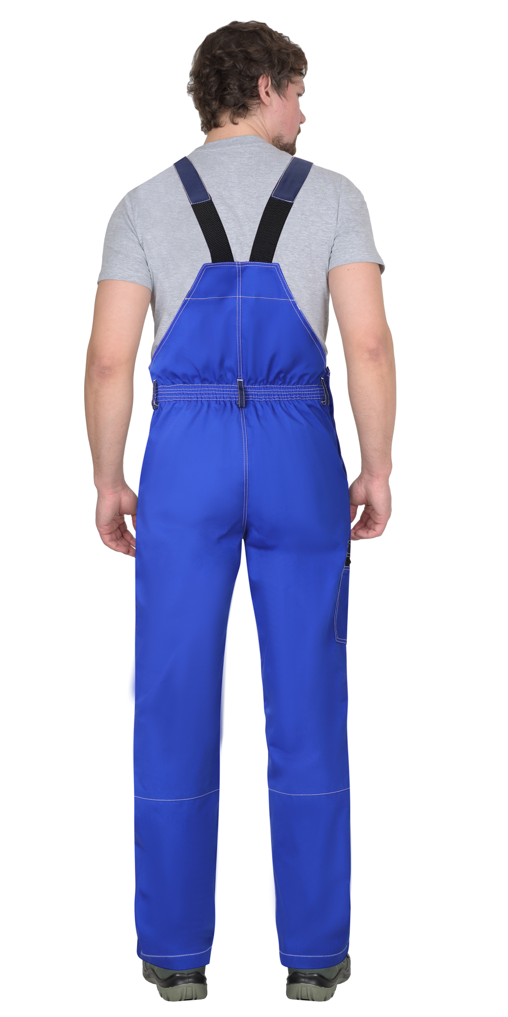 Полукомбинезон двухцветный, с застёжкой спереди - гульфик с молнией и с застёжкой в правом боковом шве на пуговицы, с наколенниками, с бретелями. Полукомбинезон спереди с боковыми внутренними карманами и нагрудным карманом с клапаном, на липучке. Сзади полукомбинезон по талии стянут резинкой для лучшего прилегания по фигуре, на правом боковом шве на уровне колена карман с молнией. Бретели с резинкой, длина бретелей регулируется застежкой-фастексом.