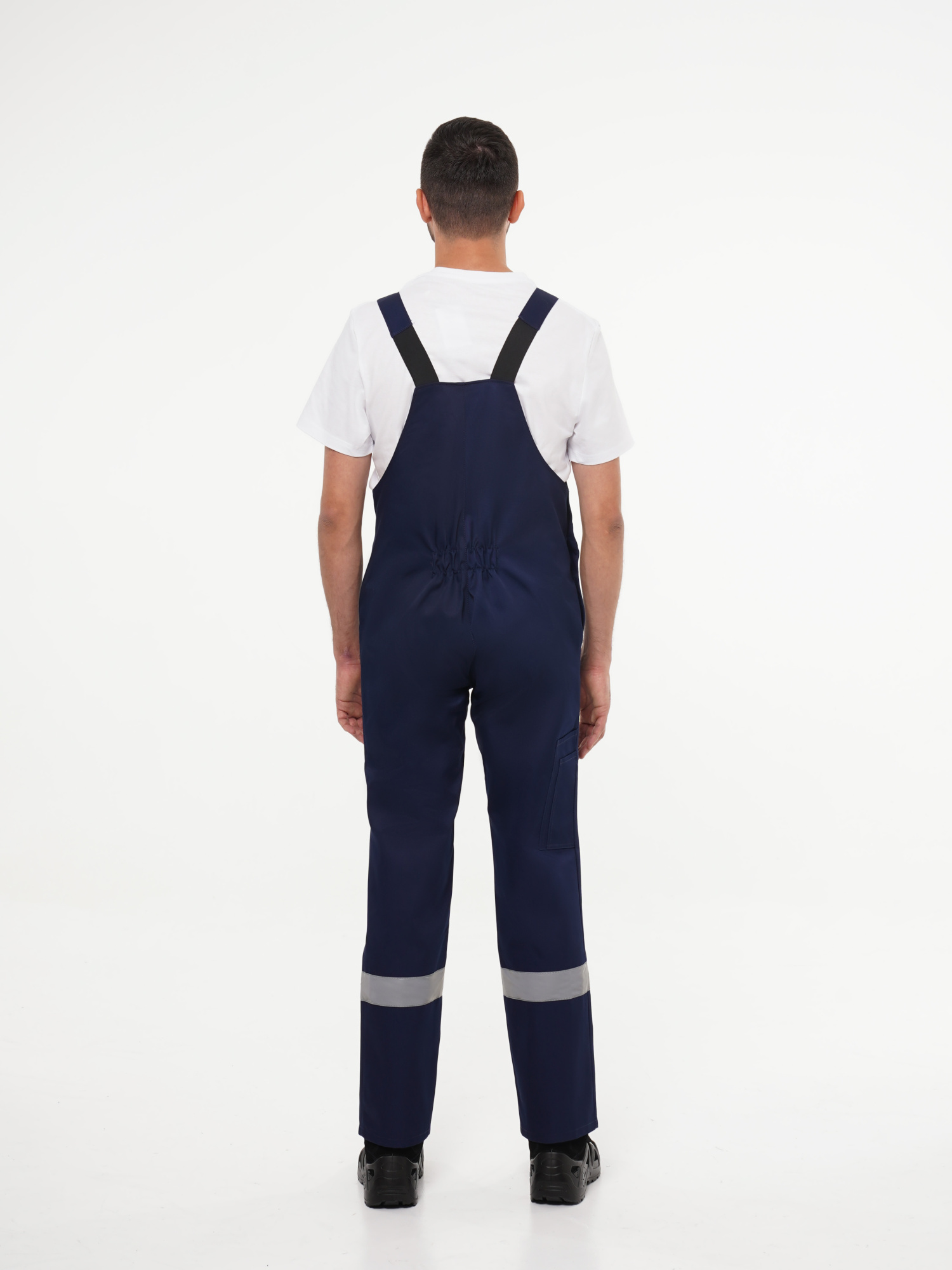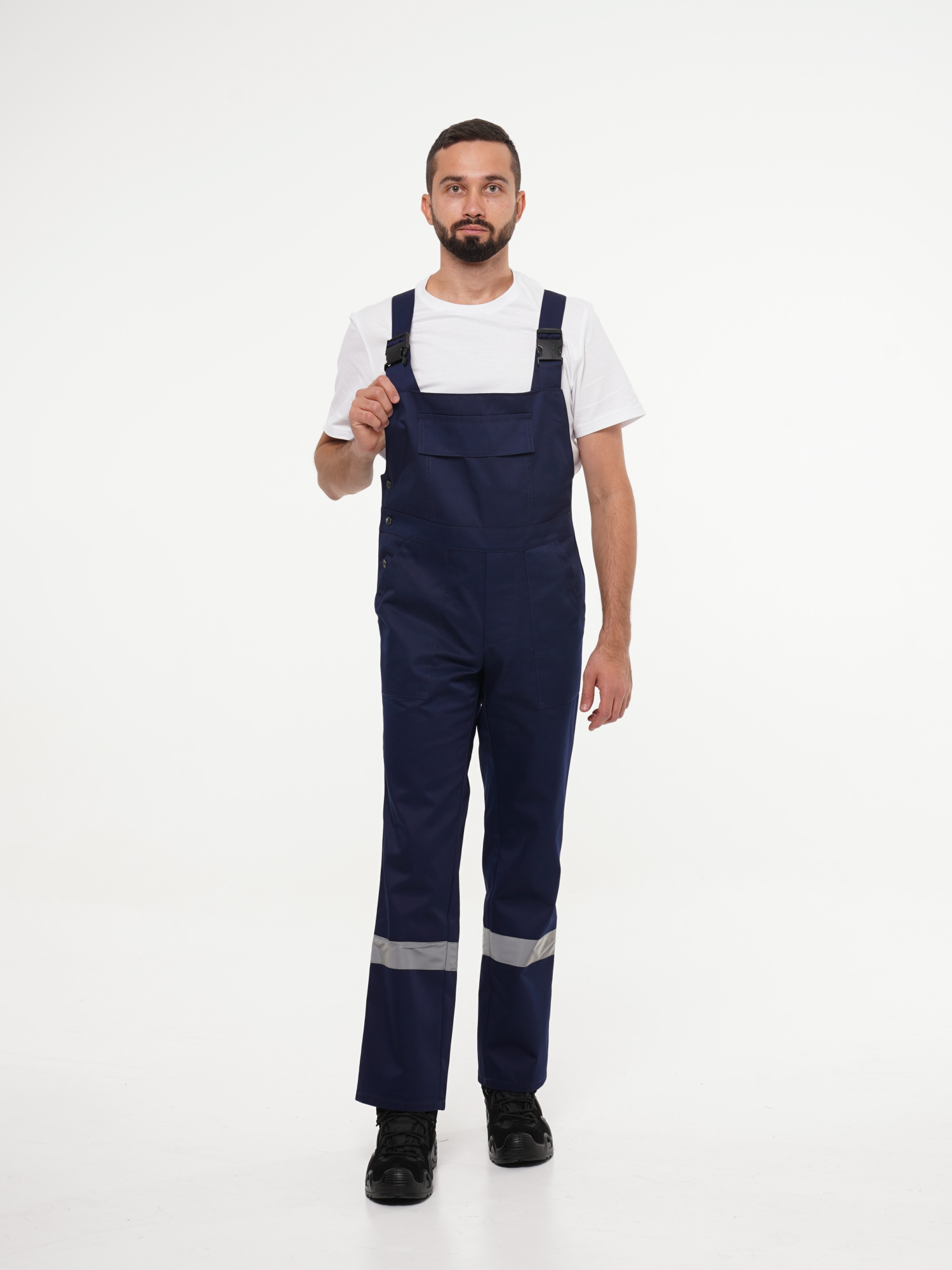 Полукомбинезон прямого покроя, с застёжкой гульфика и застёжкой в правом боковом шве на пуговицы, с карманом и клапаном на нагруднике, с боковыми накладными карманами и карманами для инструментов.