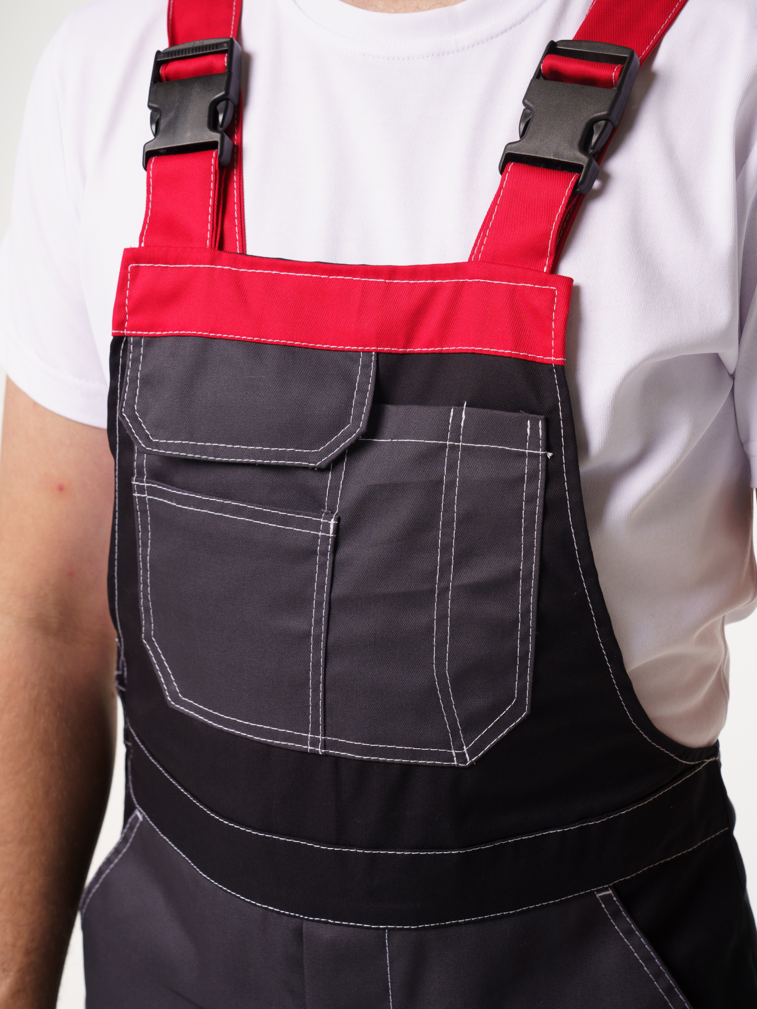 Полукомбинезон с застёжкой гульфика на молнию и застёжкой в боковом шве на пуговицы; с различными многофункциональными карманами; с объемными наколенниками; есть СОП фигурной формы .