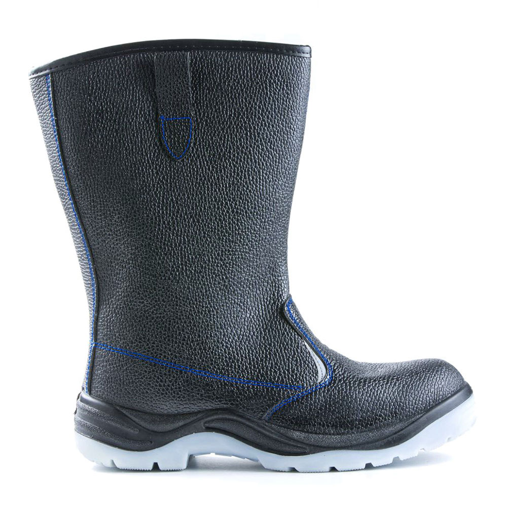 Сапоги изготовлены методом литья промежуточного слоя подошвы из полиуретана к заготовке верха обуви. На промежуточный слой из полиуретана прилит ходовой слой из термопластичного полиуретана (температурный режим от -40С до 120С) со стойкостью к деформациям и истиранию. Имеется пристроченный прилитый задний наружный ремень. Cапоги изготовлены из натуральной кожи. По верху выполнена окантовка. Подкладка из материала на нетканой основе с высокими показателями гигроскопичности CAMBRELLE, стойкого к истиранию. Стелька вкладная. С внешних сторон в верхней части голенища выполнены петли для удобства надевания. Голенище имеет высоту 30 см. В носочной части внутренний защитный подносок из металла ударной прочностью 200 Дж. В передней части имеются фигурные световозвращающие элементы. Выполнена контрастная отстрочка в тон подкладки. Подошва двухслойная (ПУ/ТПУ), МБС. Есть внутренняя амортизирующая вставка в пяточной части подошвы. Глубина профиля ходового слоя подошвы составляет 3,5 мм. Цвет сапог черный.