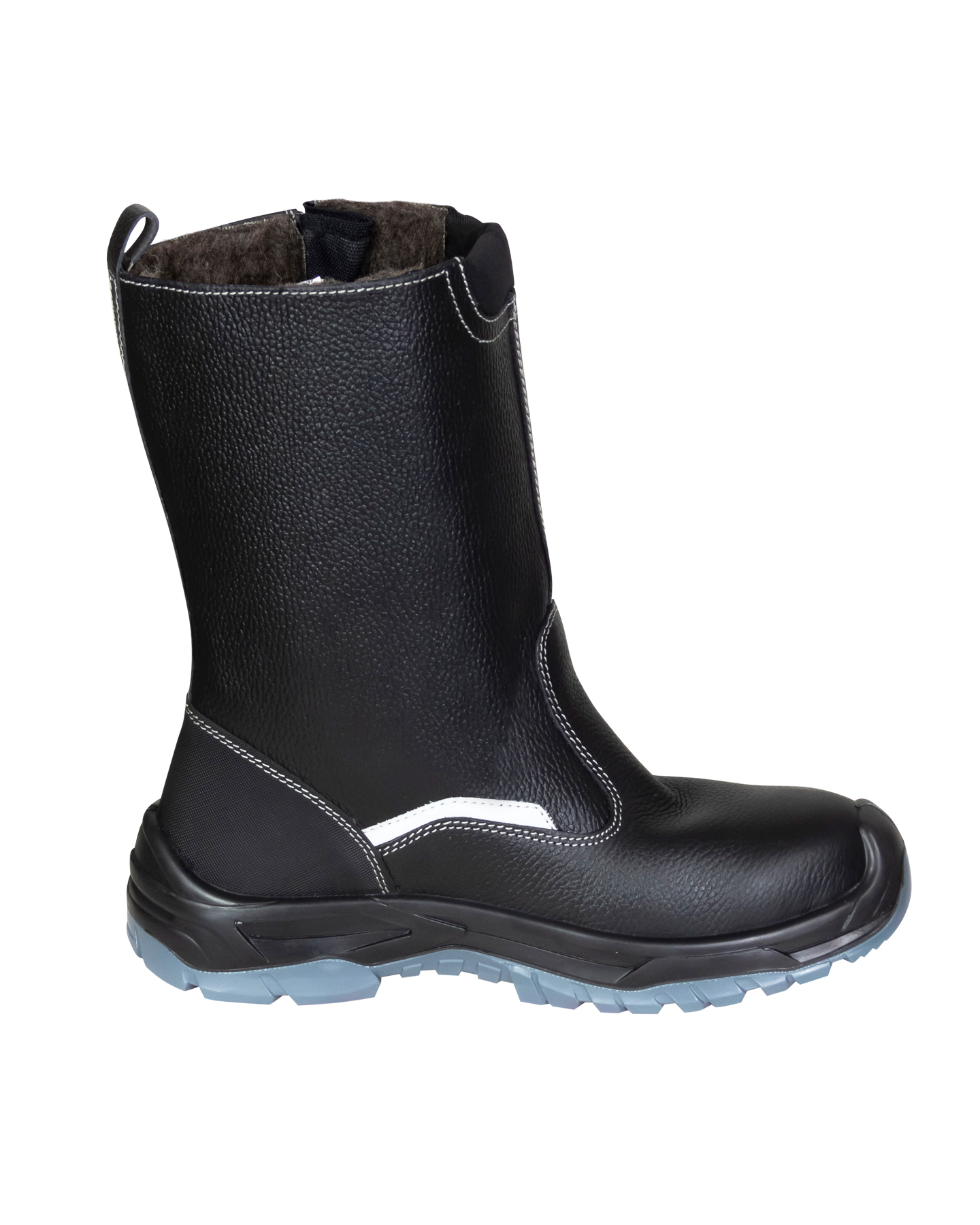 Голенище в сапогах "SAVEL-ДЖЕТ" из кожи, с помощью ремешка возможна регулировка по ширине, подкладка и вкладная стелька утеплённые, из шерстина. Имеются световозвращающие элементы для привлечения внимания и исключения несчастных случаев на производстве в темное время суток.