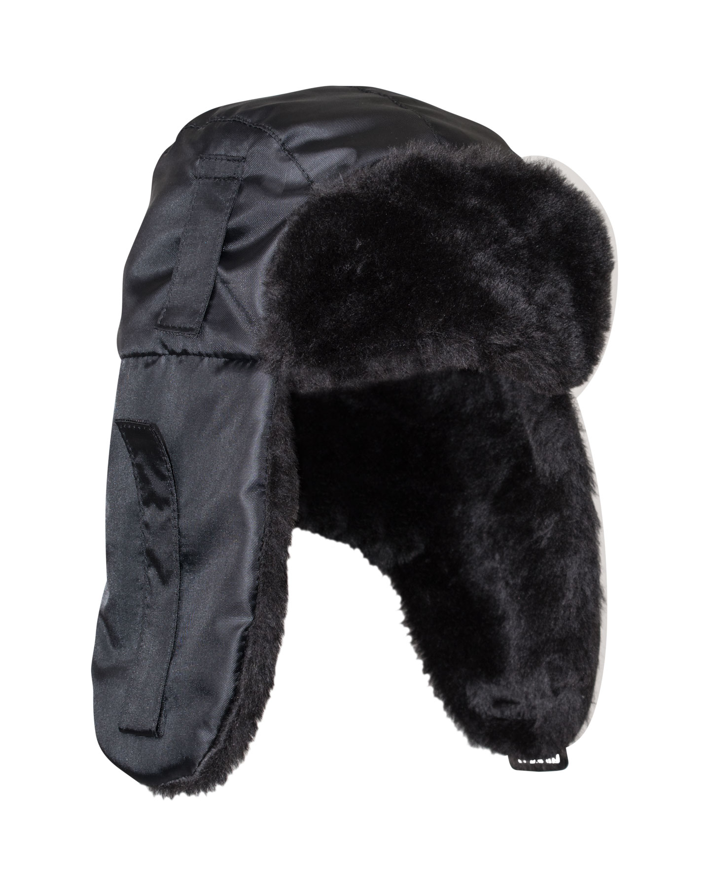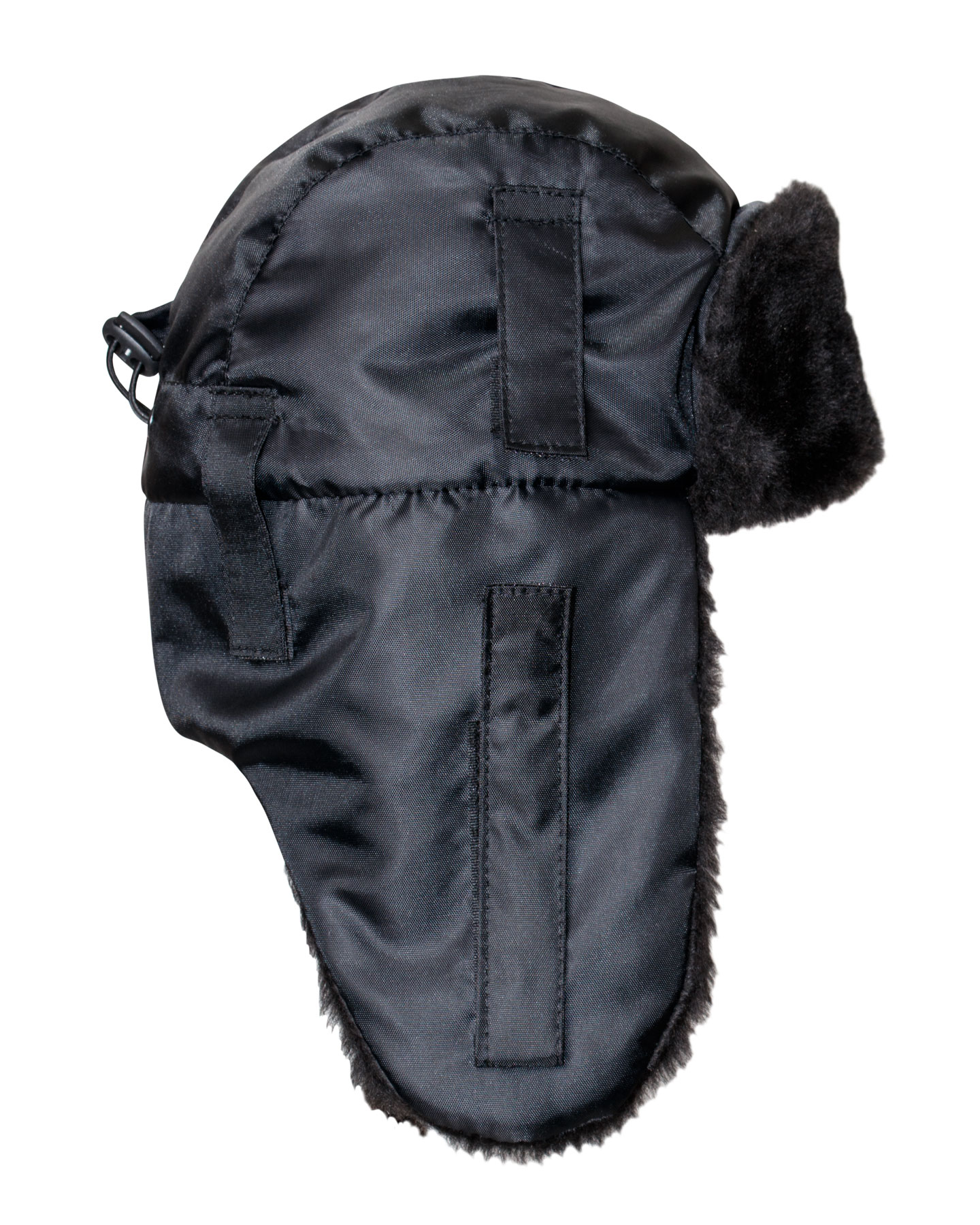 Шапка-ушанка зимняя черная с искусственным мехом черного цвета. В затылочной части объем регулируется за счет резинки и фиксатора. На боковых частях шлевки для крепления каски.