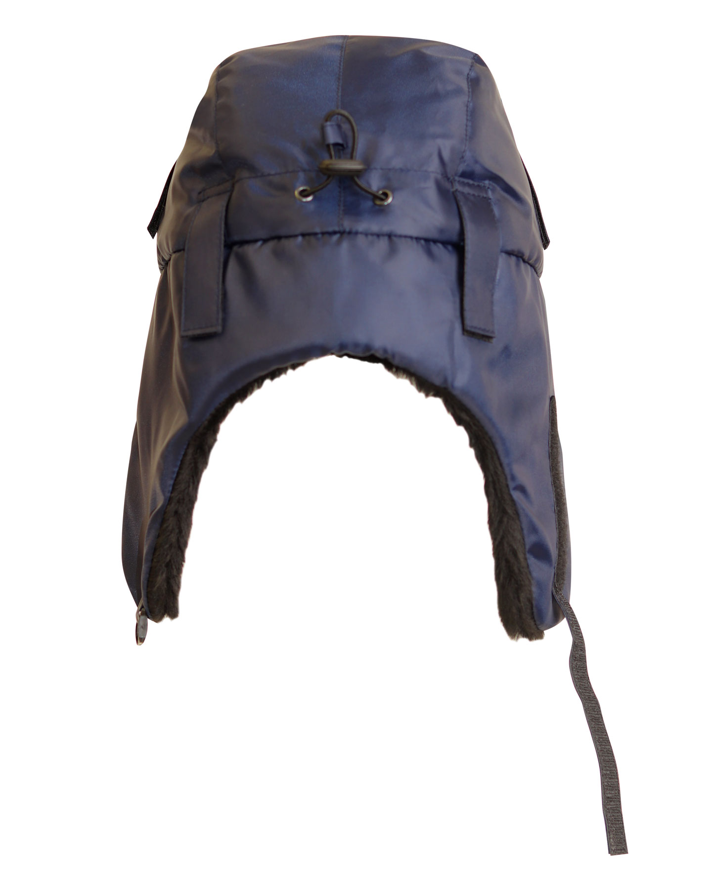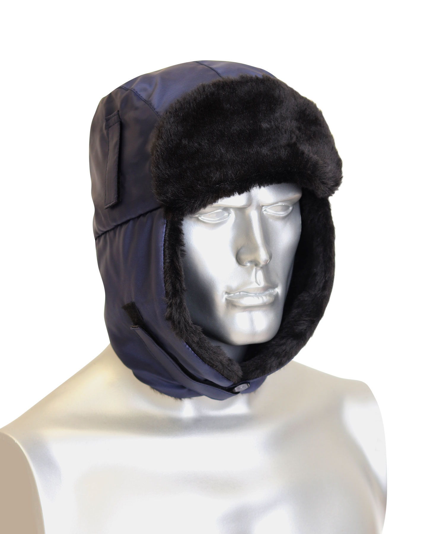 Шапка-ушанка зимняя темно-синяя с искусственным мехом черного цвета. На затылочной части резинка для более плотного прилегания к голове. На боковых частях шлевки для крепления каски.