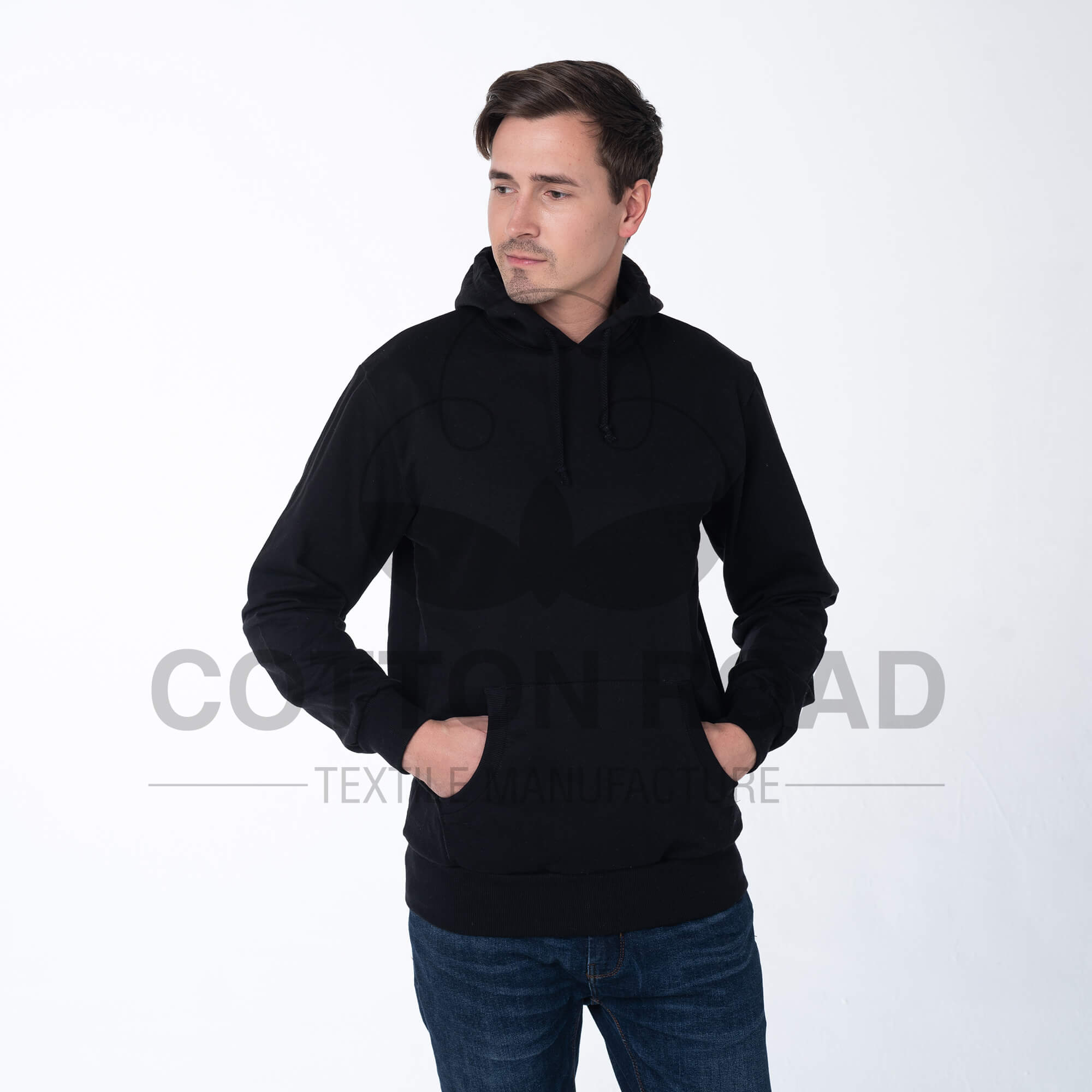 Основное полотно — Футер с начёсом из 100 % кольцепрядильной х/б пряжи №е 24/1. Ластичное полотно — Ластик 1х1 — 95% - кольцепрядильная х/б пряжа №е 30/1, 5%- лайкра. Шнур вязальный — 100% х/б кольцепрядильная пряжа.