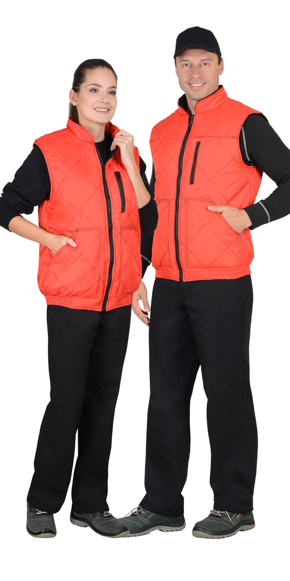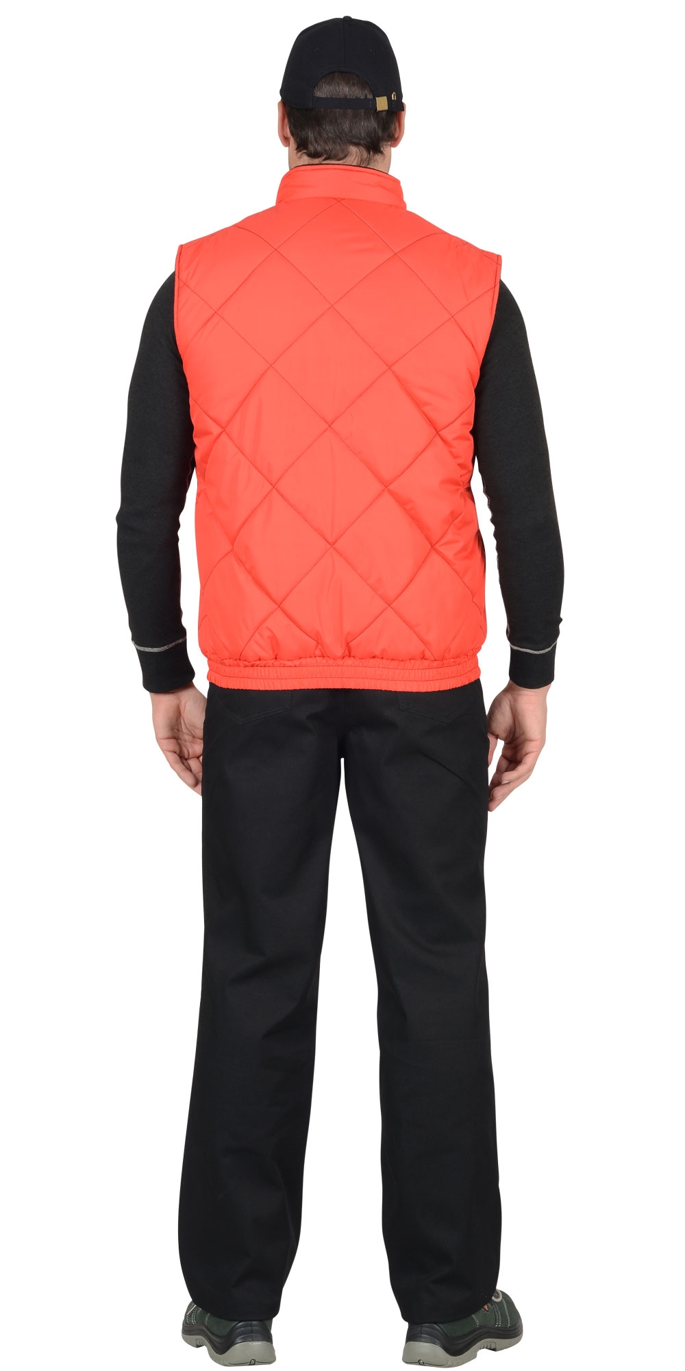 Жилет утеплённый, стёганный, на подкладке из флиса с центральной бортовой застёжкой на молнию, с воротником стойка, с нагрудным карманом с молнией и нижними фигурными утеплёнными карманами. Жилет на притачном поясе стянутом резинкой. ГОСТ 25295-2003