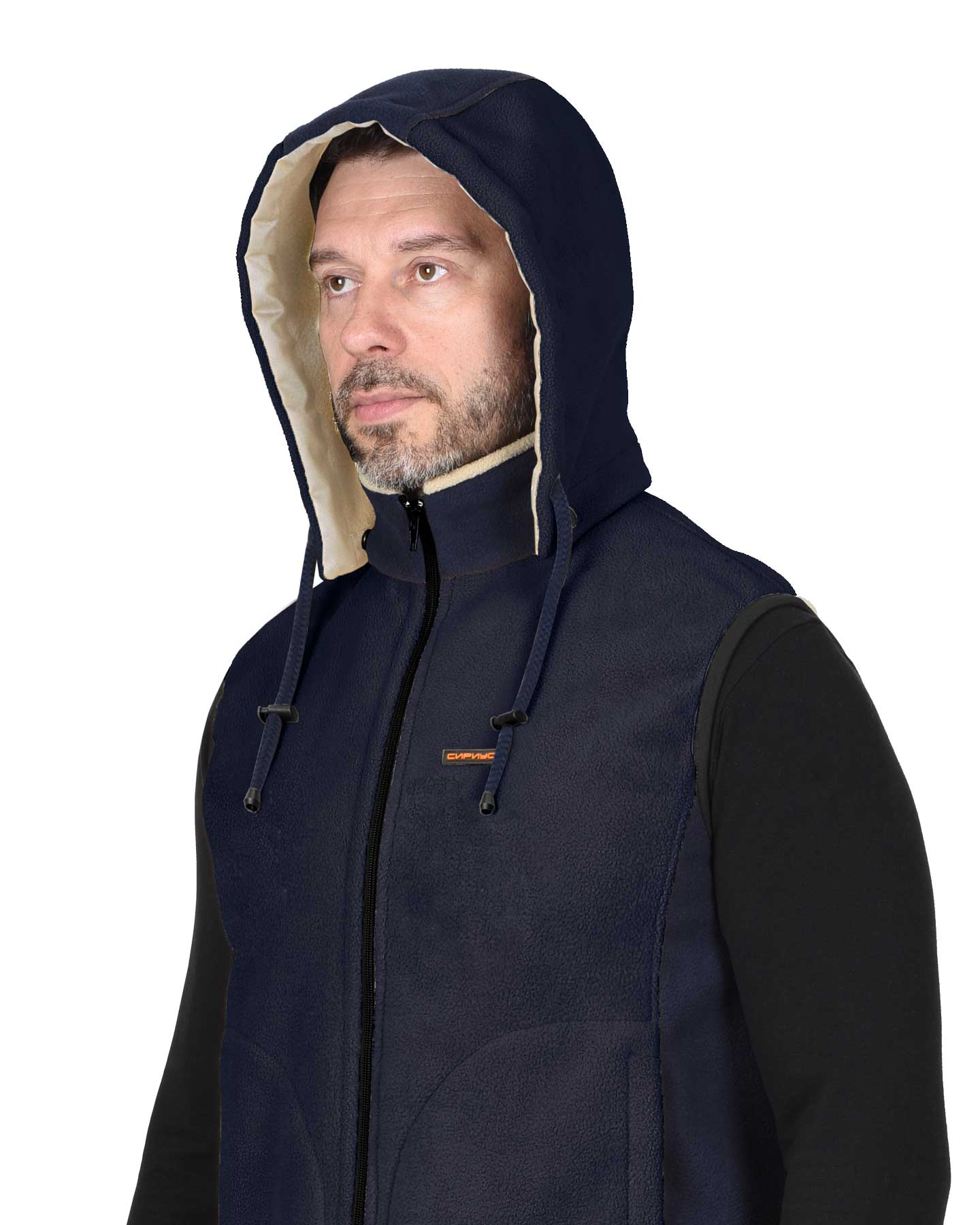 Жилет из дублированного флиса, без подкладки, прямого силуэта, с втачным воротником стойка, со съёмным капюшоном, со сквозной центральной, бортовой застёжкой на молнию, с отрезными бочками, с нижними боковыми карманами в рельефе. Пройма окантована резинкой ш.25 мм. ТР ТС 017/2011