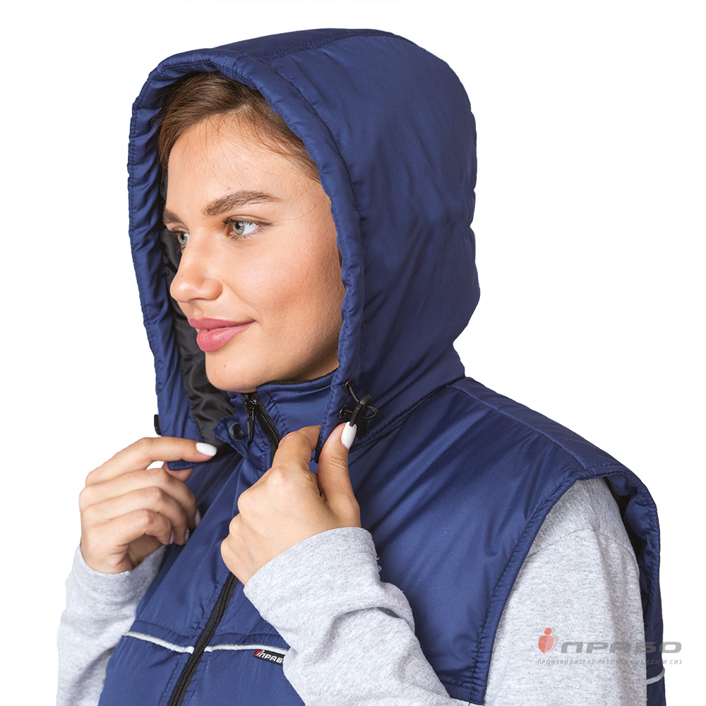 Капюшон: утеплённый, съёмный на кнопках. Объём по лицевому вырезу регулируется эластичным шнуром, продетым в кулиску и фиксаторами. Низ жилета регулируется по объёму с помощью кулиски с эластичным шнуром и фиксаторами.