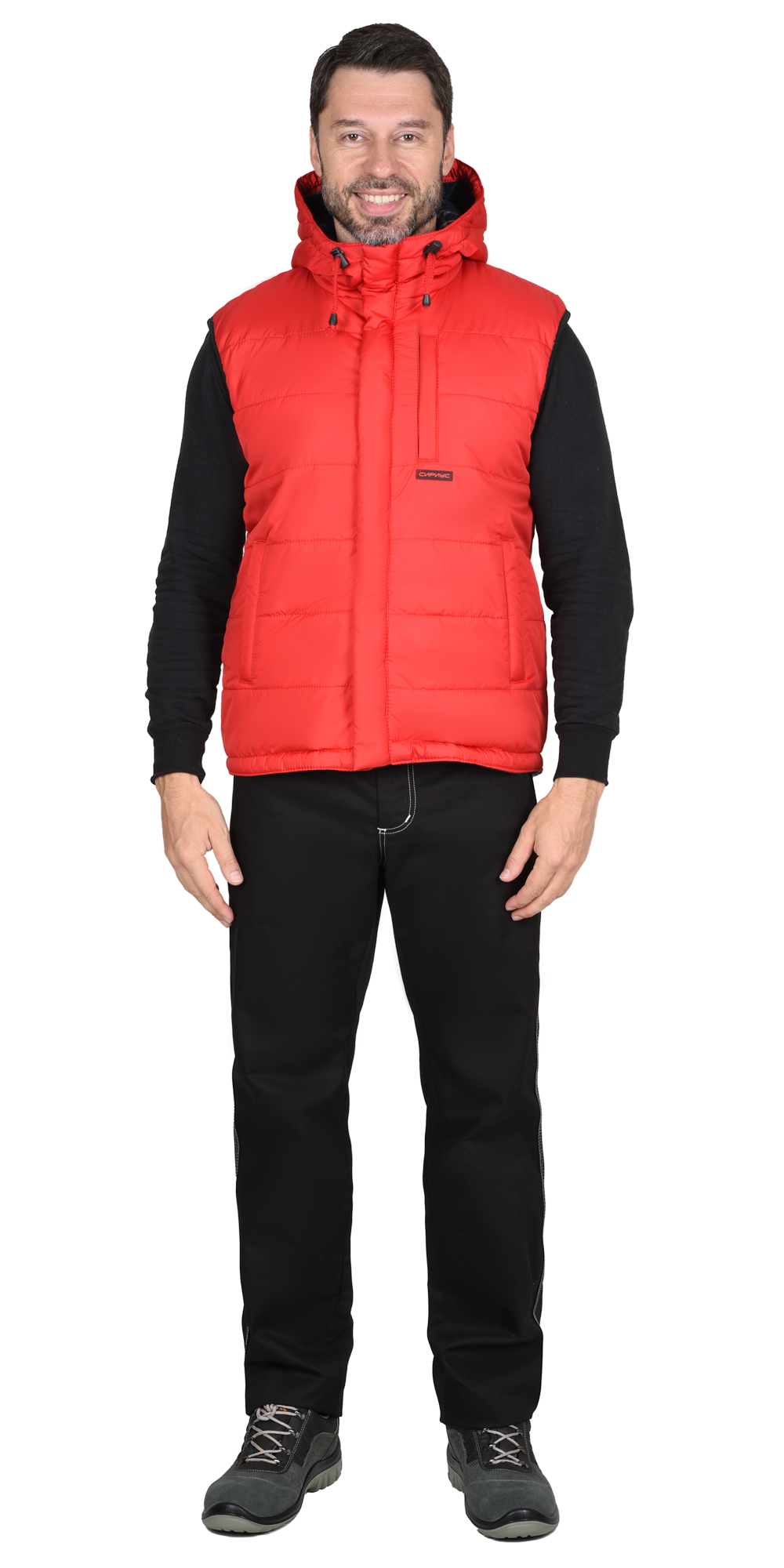 Жилет утеплённый, выстеган с утеплителем горизонтальными строчками, на флисовой подкладке контрастного цвета, с втачным капюшоном, с застёжкой на молнию, прикрытую ветрозащитным клапаном от края капюшона до низа изделия, застёгивающимся на кнопки. Жилет с одним нагрудным карманом с молнией и двумя нижними карманами. Спинка жилета, удлинённая с фигурной линией низа. Пройма окантована резинкой. Объём капюшона по лицевому вырезу регулируется шнуром с фиксаторами.