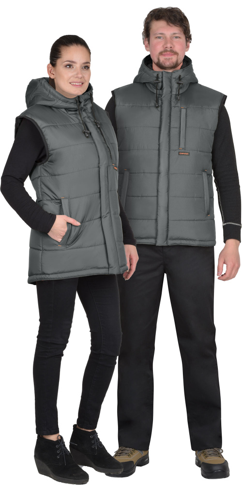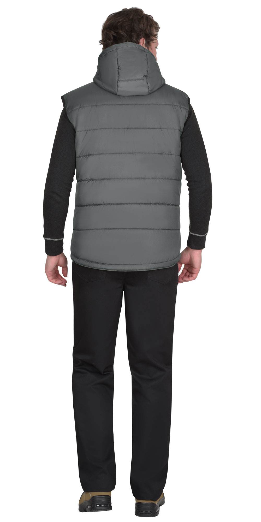 Жилет утеплённый, выстеган с утеплителем горизонтальными строчками, на подкладке, с втачным капюшоном, с застёжкой на молнию, закрытую ветрозащитным клапаном от края капюшона до низа изделия, застёгивающимся на кнопки. Жилет с одним нагрудным карманом с молнией и двумя нижними карманами. Спинка жилета, удлинённая с фигурной линией низа. Пройма окантована резинкой. Объём капюшона по лицевому вырезу регулируется шнуром с фиксаторами.